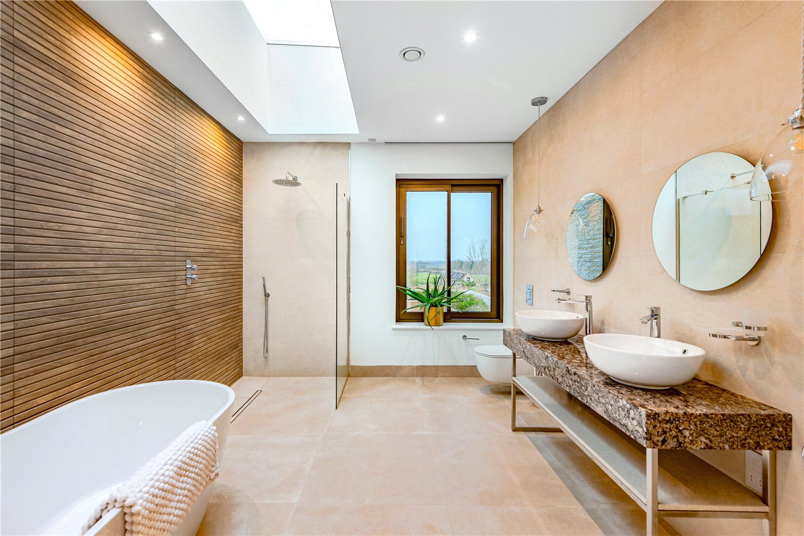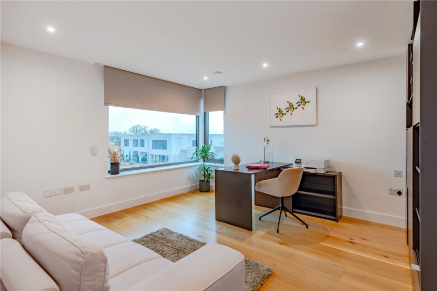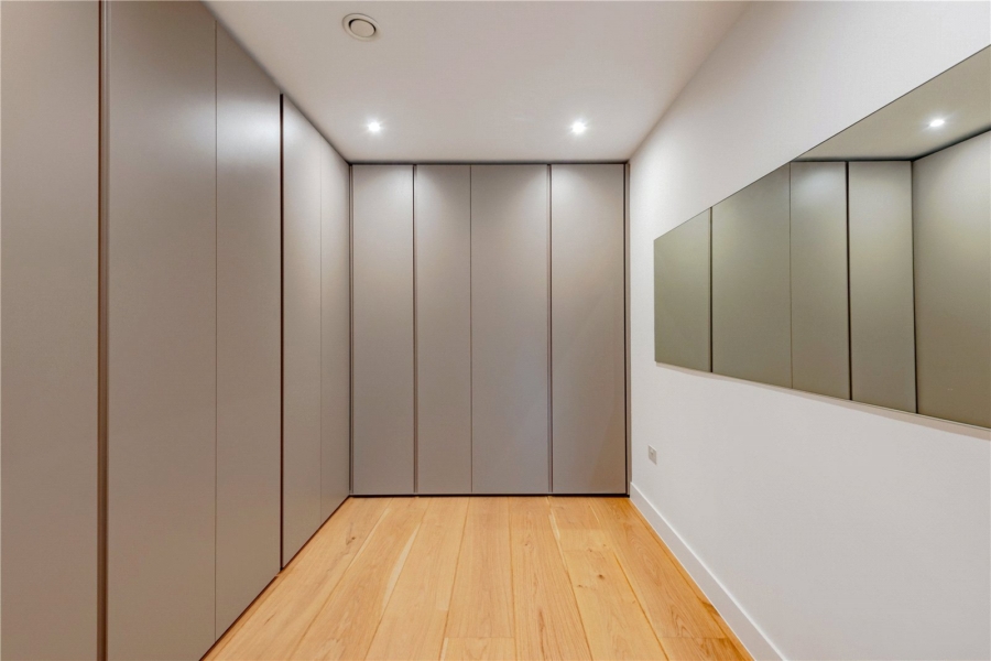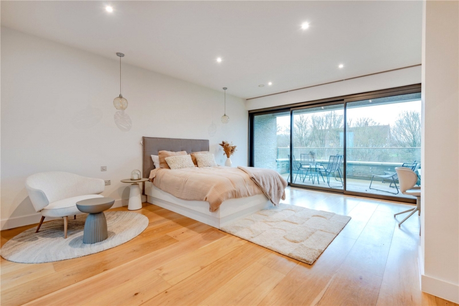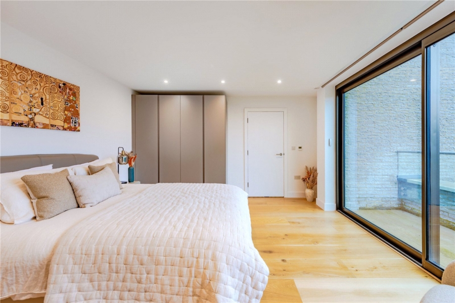 The principal suite is a true retreat. A bespoke dressing room leads to a beautifully appointed en-suite, featuring twin sinks, a walk-in shower, illuminated by a rooflight, and a freestanding bath — the ultimate sanctuary for rest and rejuvenation.