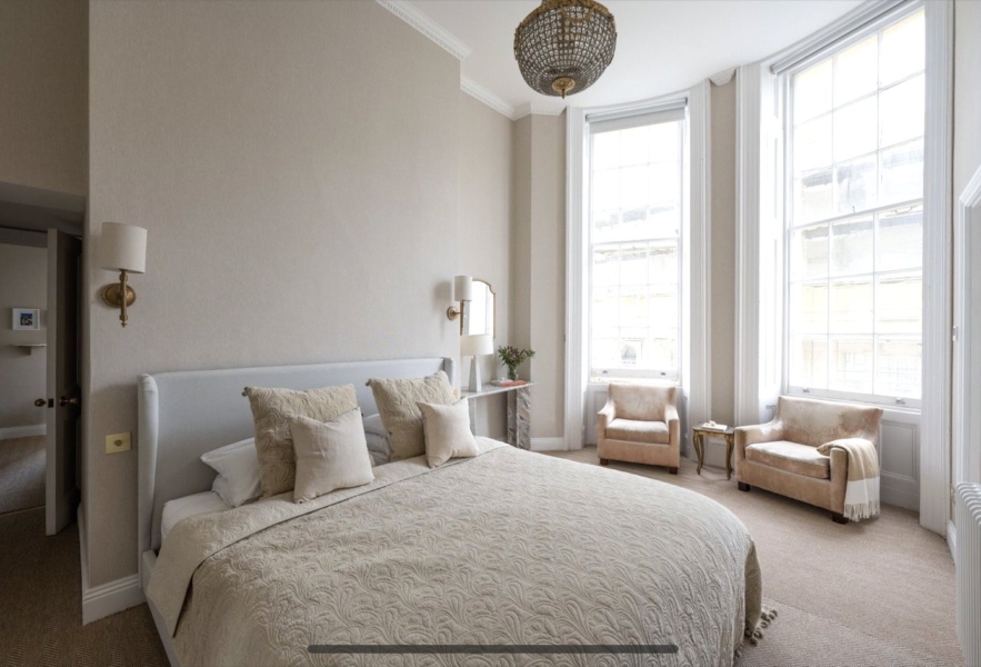 To the rear, two well-appointed bedrooms offer calm and comfortable accommodation, each enhanced by elegant curved bay walls that introduce both charm and natural light. The principal bedroom is particularly impressive in scale, creating a luxurious retreat, while the second bedroom offers excellent versatility, ideal for guests, a home office, or additional sleeping accommodation.