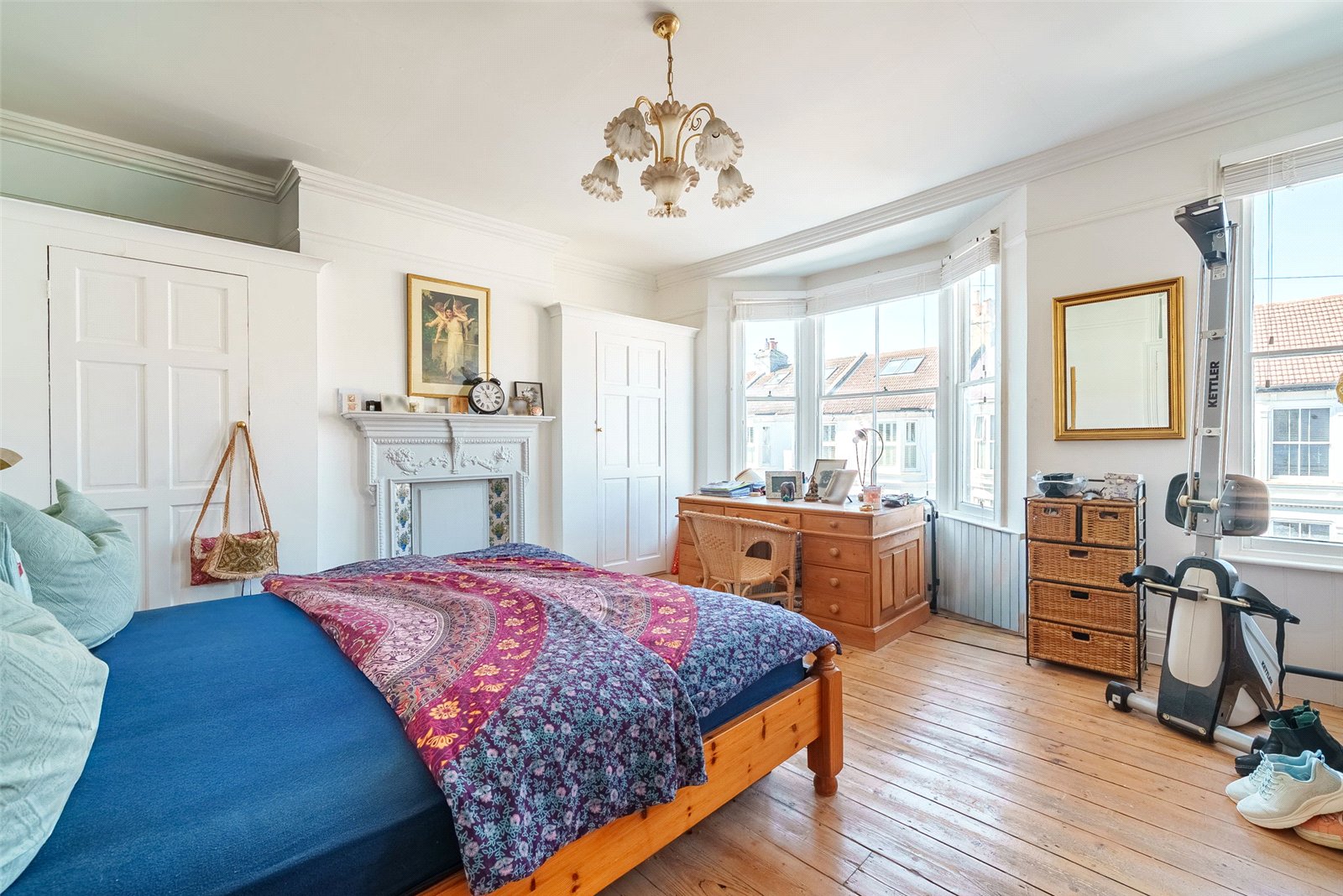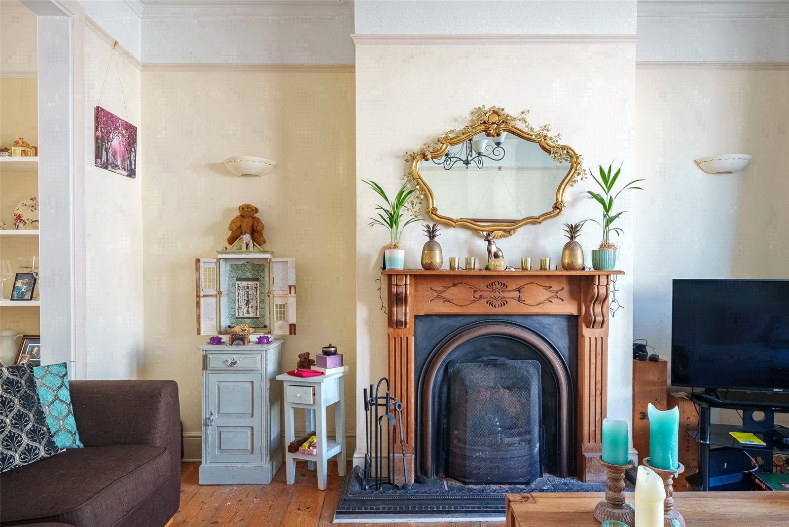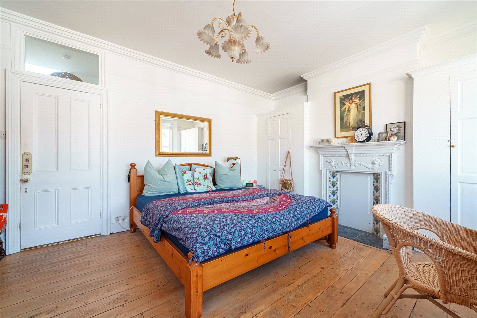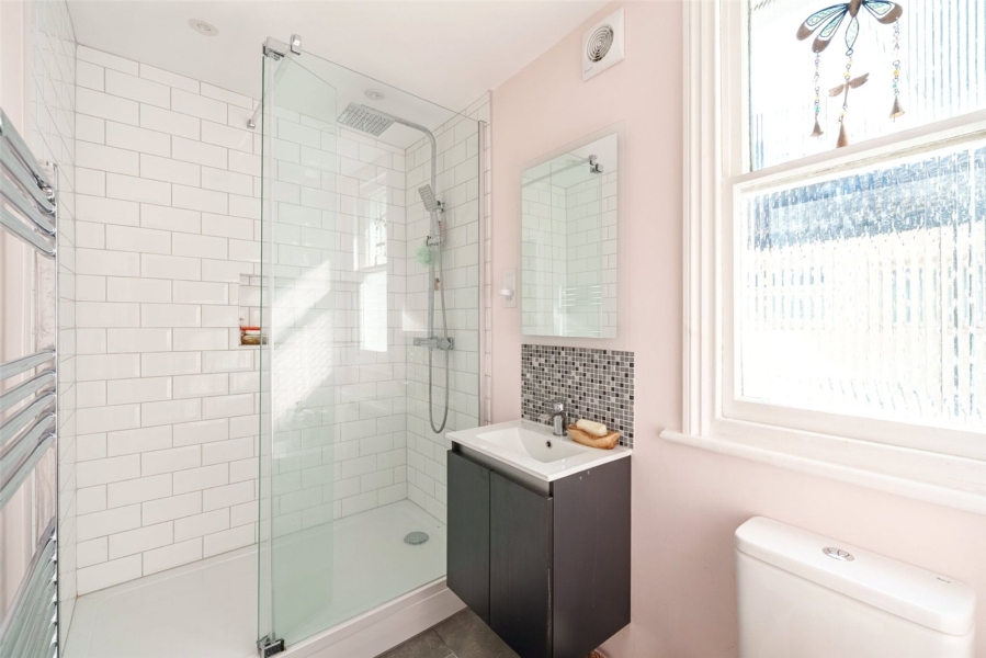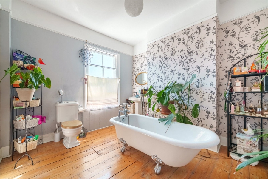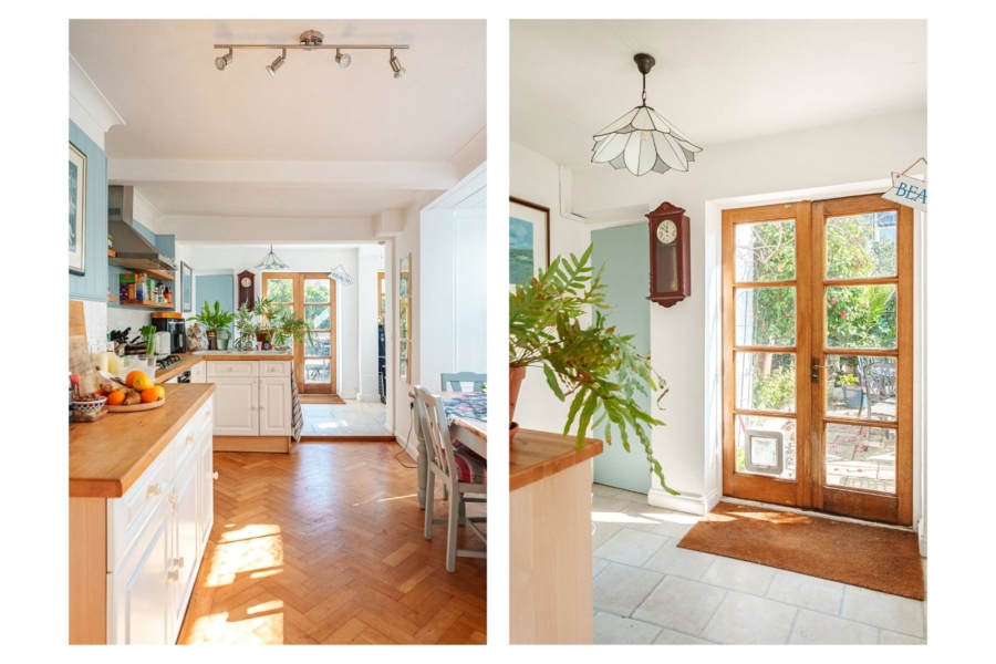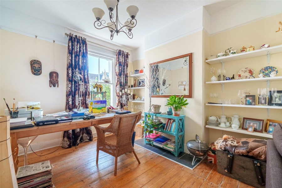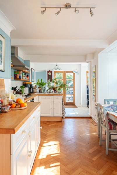 Inside, the property showcases generous proportions, with soaring ceilings and a host of original features that create a welcoming and refined atmosphere. The ground floor has been thoughtfully enlarged to enhance everyday living, centred around a spacious, country-inspired kitchen and dining area. Bathed in natural light from a charming south-facing bay window, this space is perfectly suited to both family life and entertaining. A bright, dual-aspect reception and dining room runs through the property, complete with a feature fireplace, providing a comfortable setting for relaxing or hosting guests.