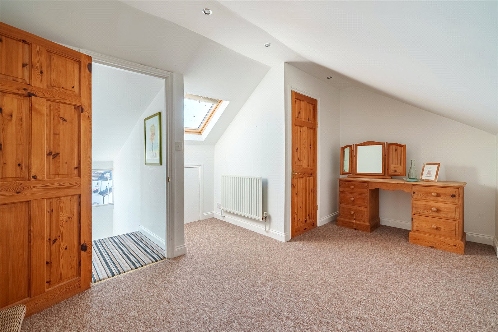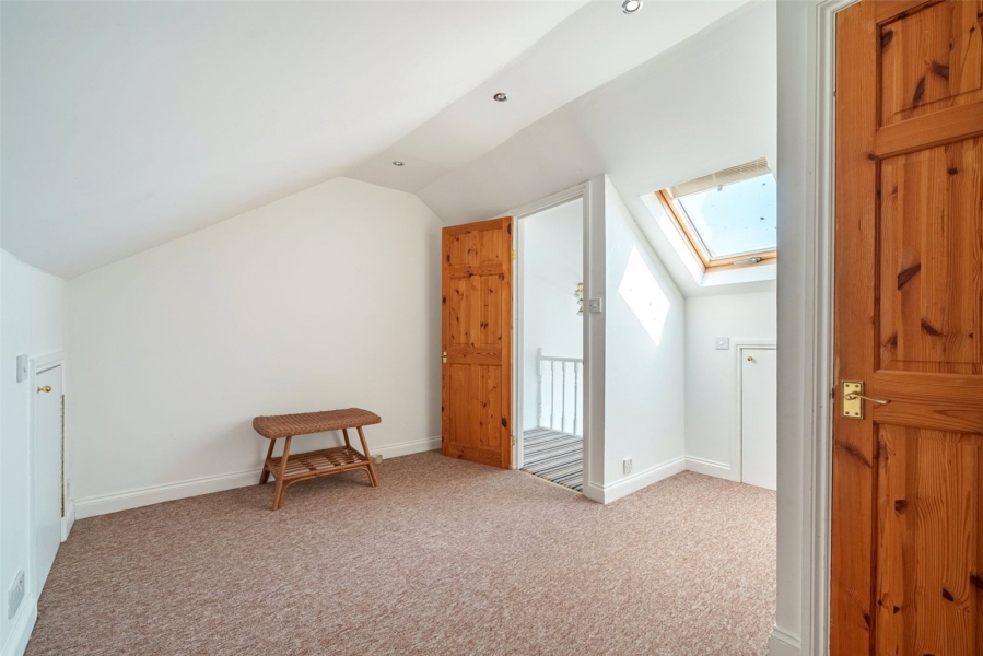 Arranged over the upper floors are well-proportioned bedrooms, including a principal suite with fitted period-style storage. A contemporary shower room, an additional loft room with its own en-suite, and a beautifully appointed family bathroom offer flexible and practical accommodation for a variety of needs. A separate cloakroom further enhances convenience for busy households.