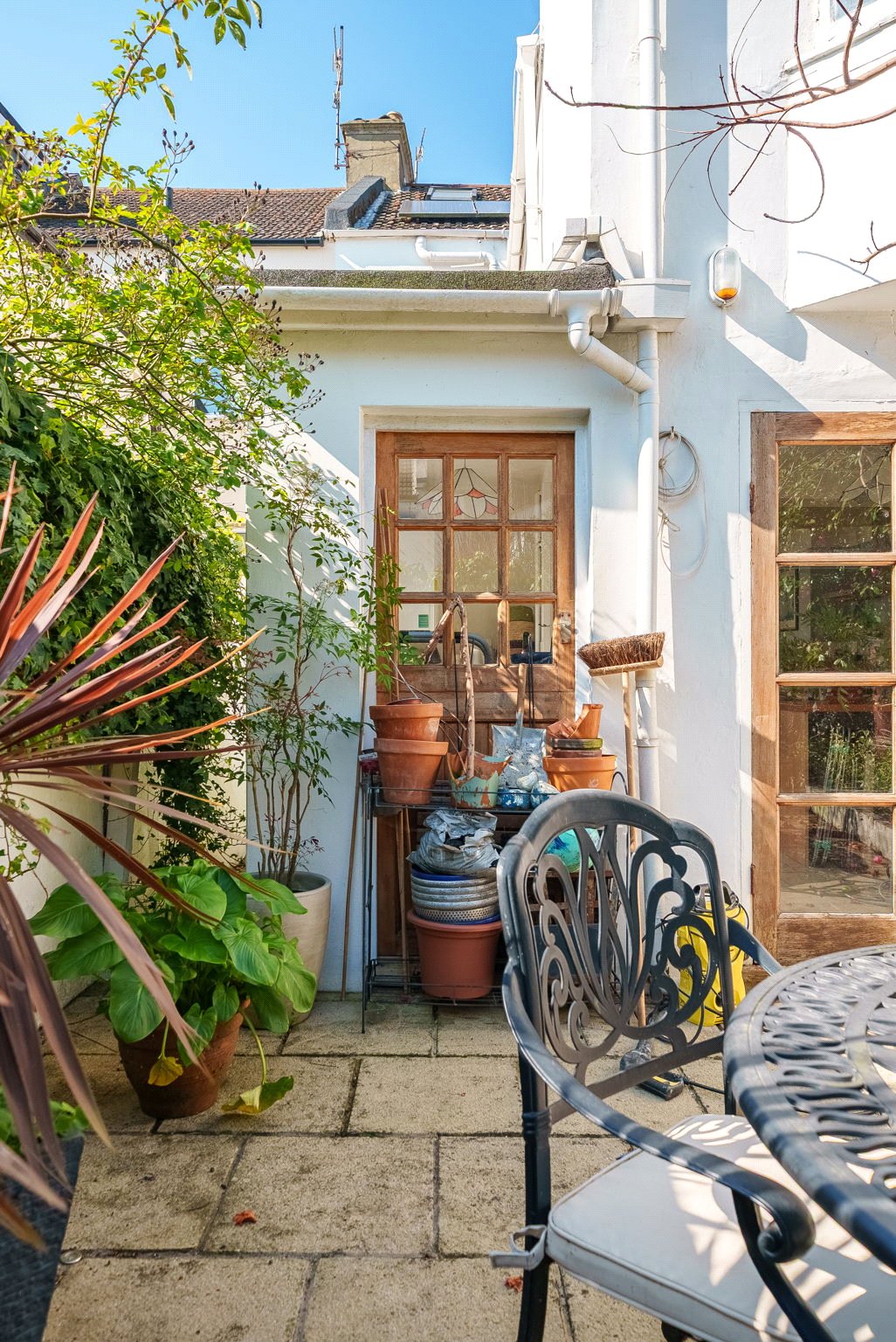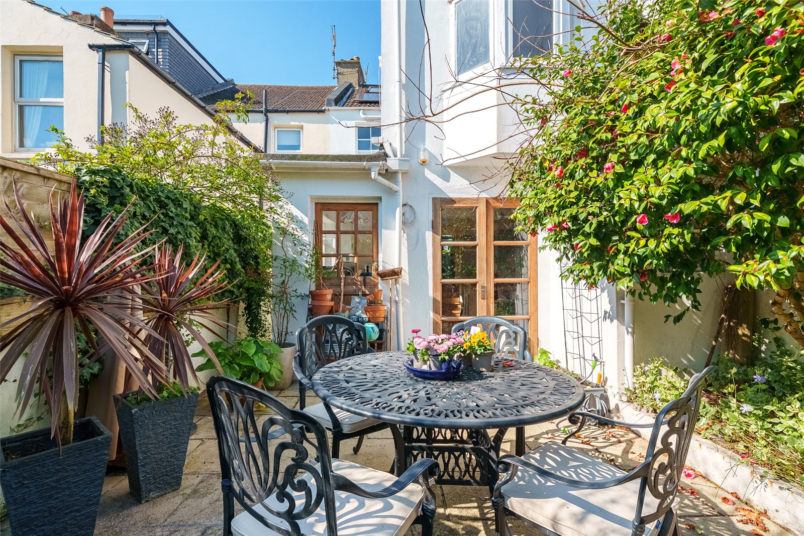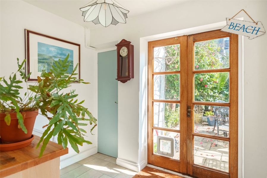 To the rear, the garden provides a peaceful and private retreat. Thoughtfully landscaped with established trees, planting, and borders, it offers a secluded outdoor haven, easily accessed via French doors from the kitchen—ideal for enjoying quiet moments or alfresco dining.