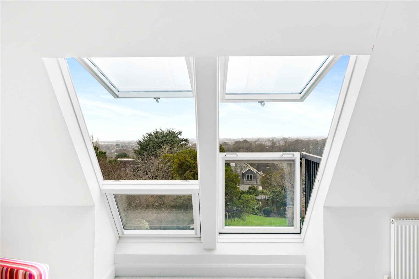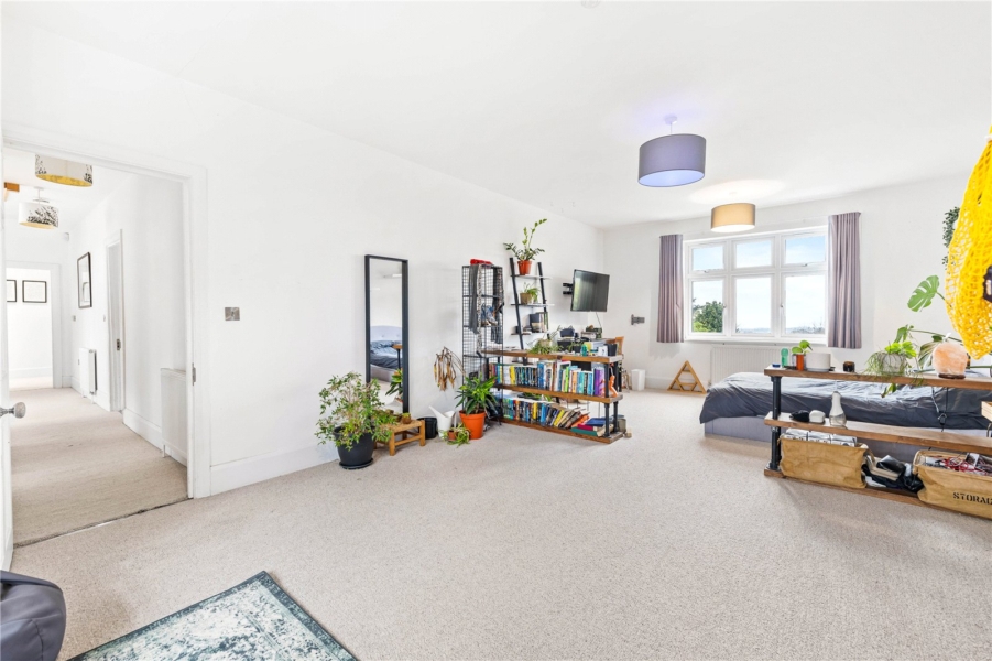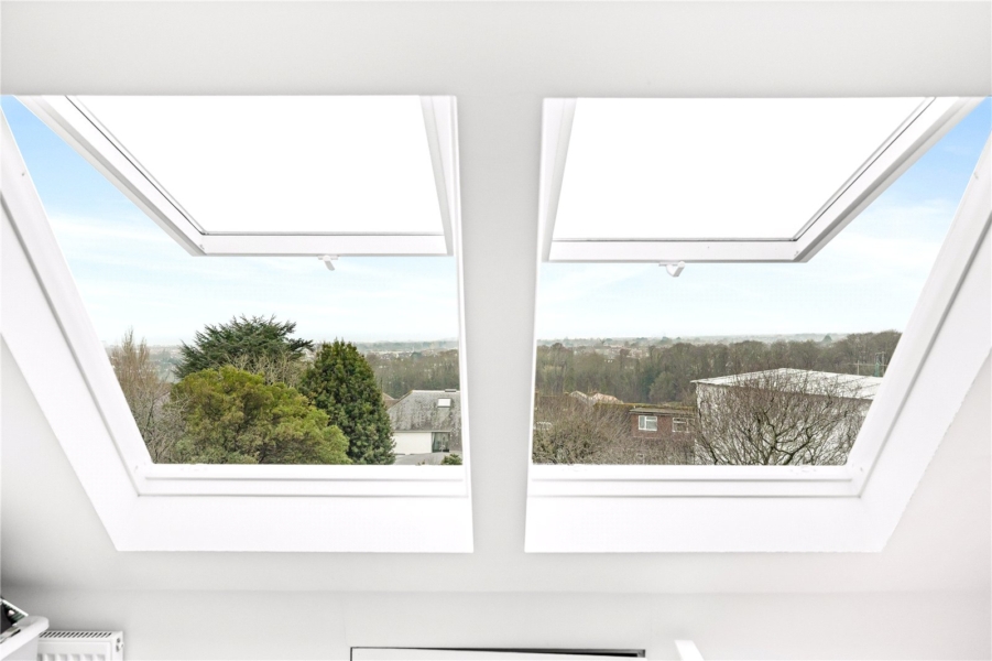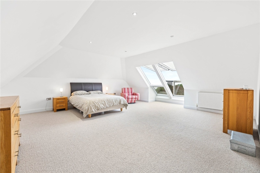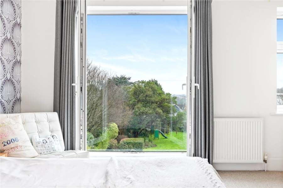 The upper floors provide generous and flexible bedroom accommodation. The first floor hosts an impressive principal suite complete with walk-in wardrobe and en-suite bathroom, alongside two further well-proportioned bedrooms and a family bathroom. The top floor offers two additional spacious double bedrooms and a further bathroom, making the property perfectly suited to larger families, guests or multi-generational living. All bedrooms enjoy stunning south-facing views towards the sea.
