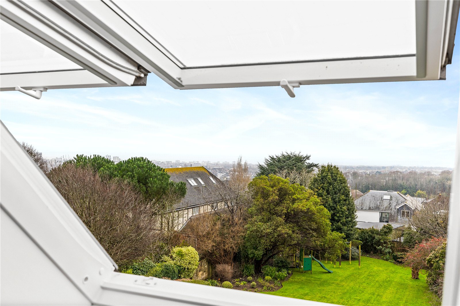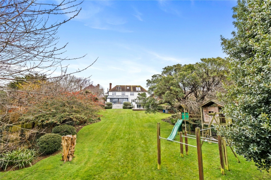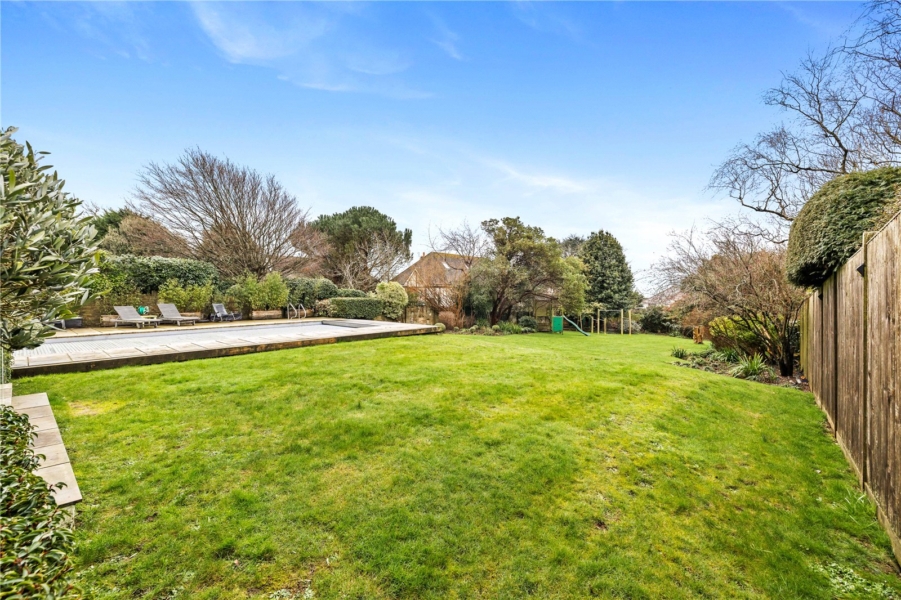 The lower ground floor significantly enhances the home’s lifestyle appeal, featuring an impressive leisure suite comprising a dedicated pool room and bar area, together with shower facilities. Doors open directly onto the outdoor heated swimming pool and an exceptional south-facing rear garden — a truly standout feature. The garden is remarkably large for the area, offering expansive outdoor space ideal for entertaining, relaxation and family enjoyment, and represents a rare offering within residential Hove.
