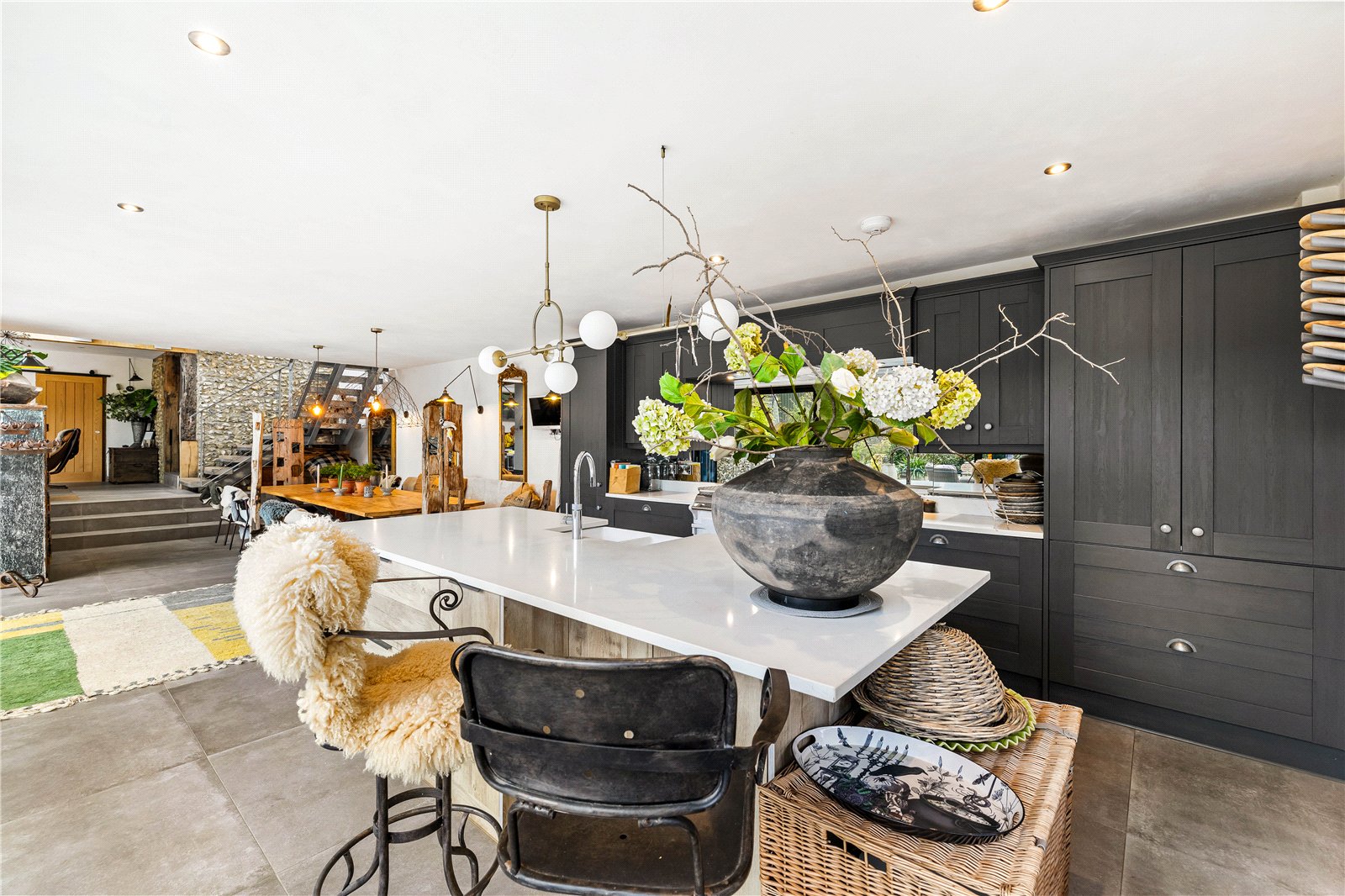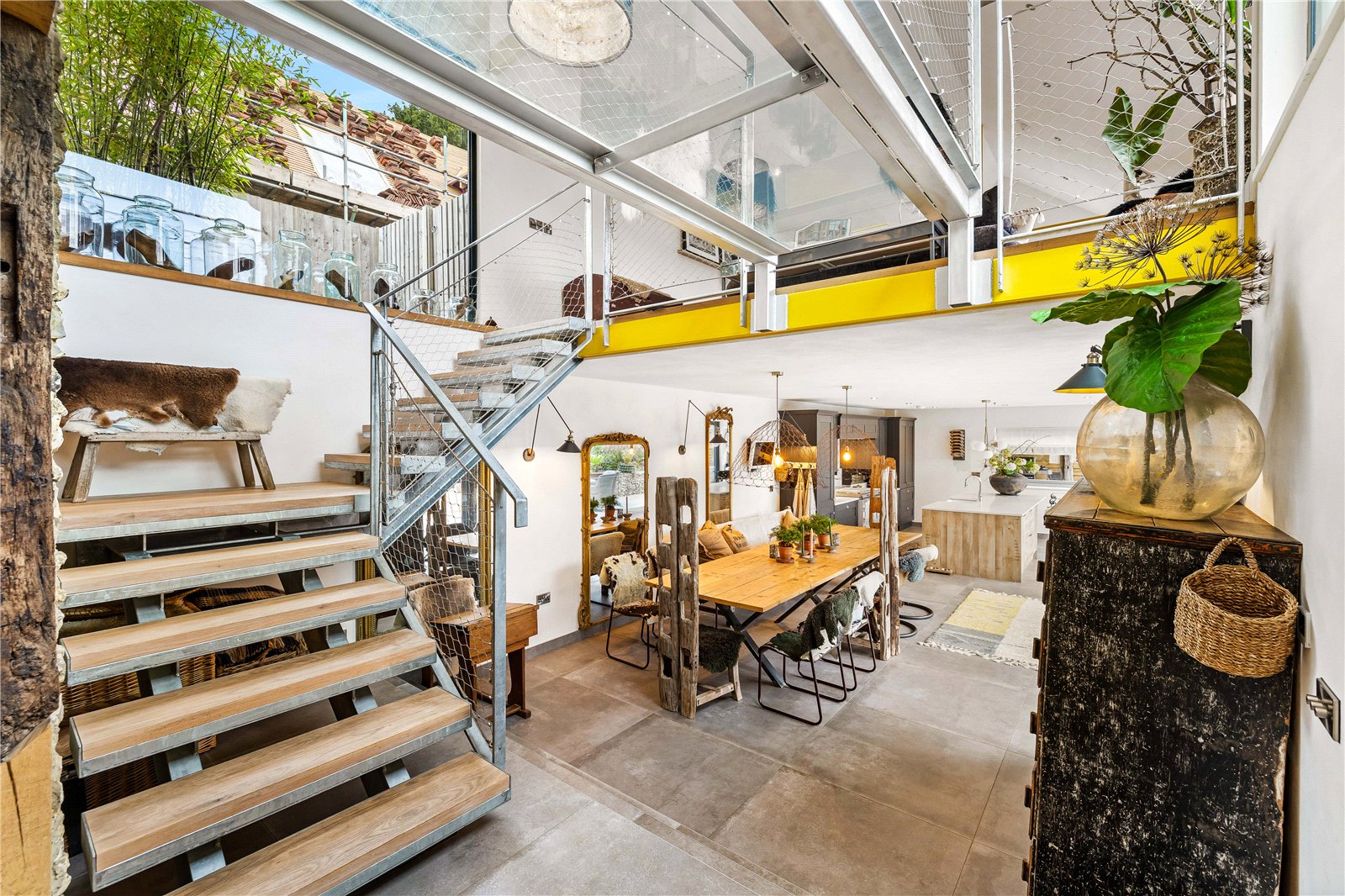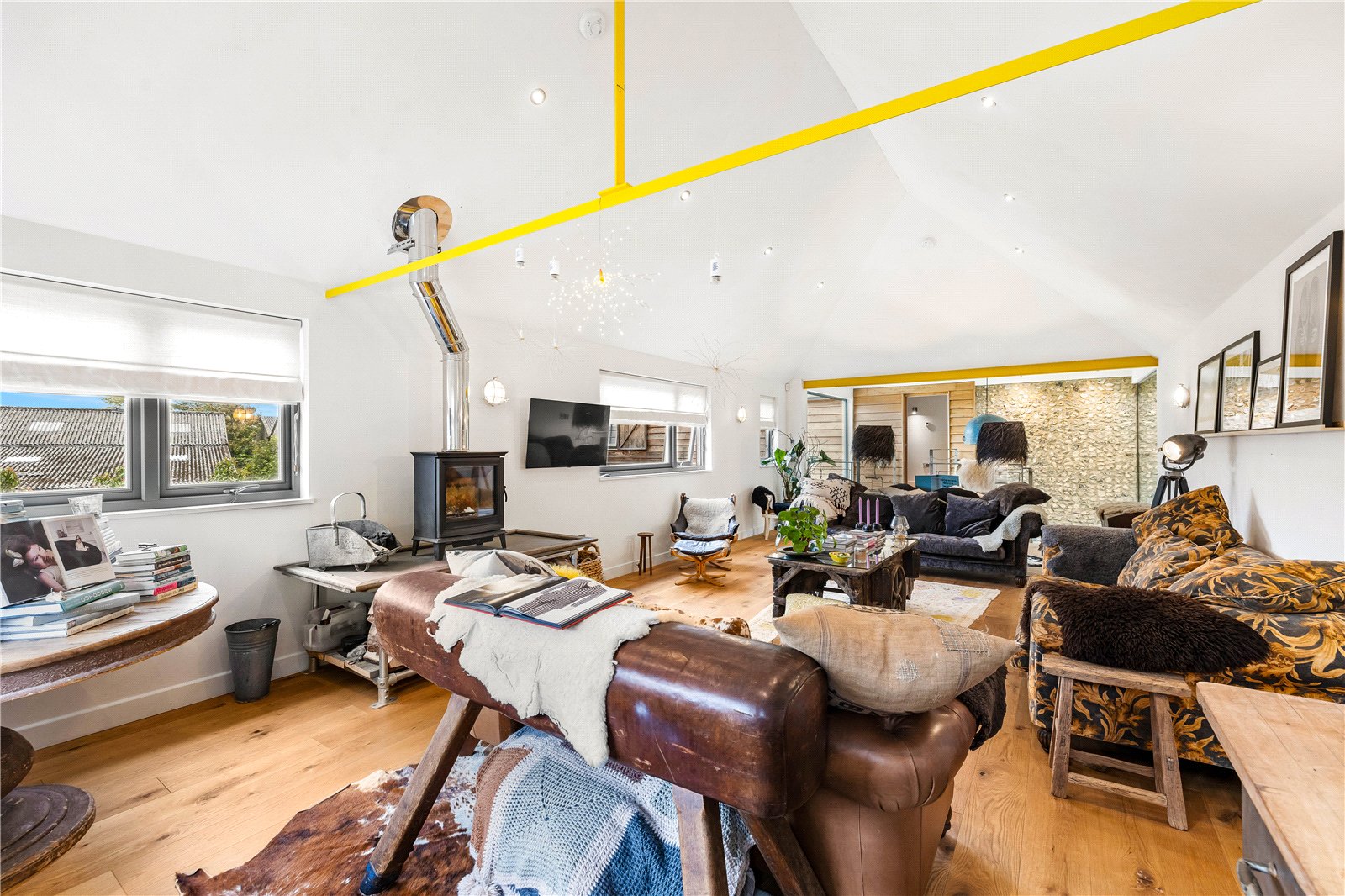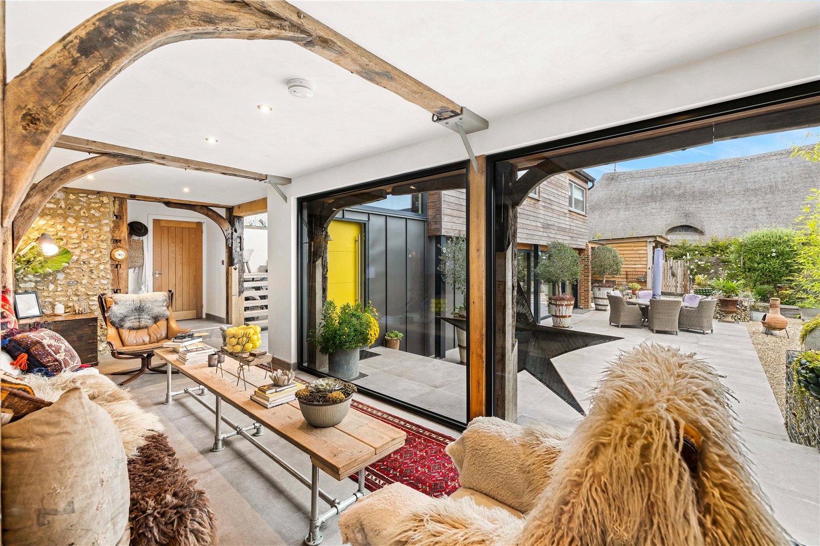 The current owners have carried out a complete top-to-bottom restoration with meticulous attention to both heritage and craftsmanship, earning the project an English Heritage Award. The result is a rare blend of authenticity and modern industrial design, where bold floor-to-ceiling glazing and dramatic vaulted ceilings sit comfortably alongside centuries-old oak.