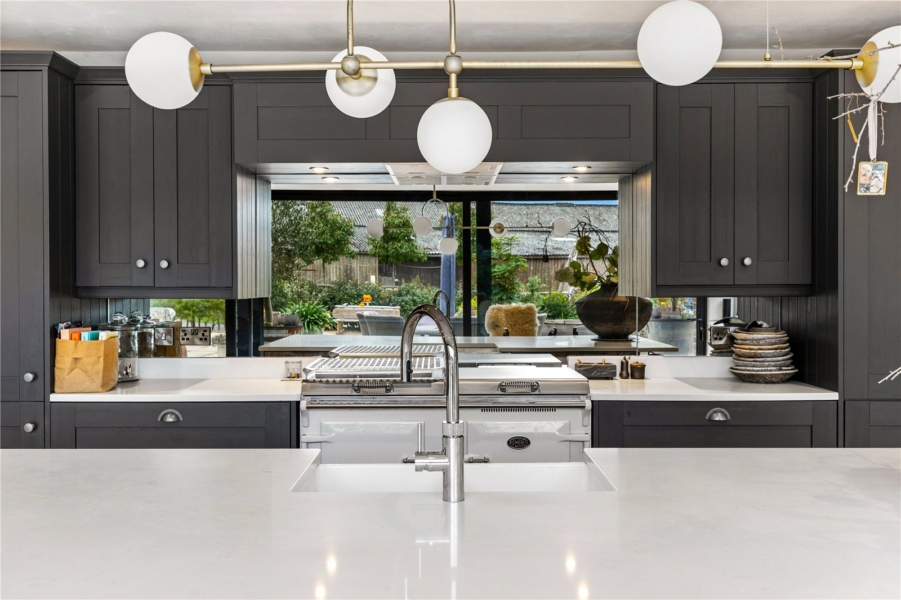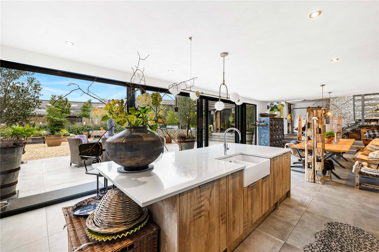 Internally, the accommodation has been designed to provide flexible and adaptable living. At its heart lies a remarkable 41-foot kitchen and dining room, with full-height double sliding doors opening onto the terrace to create a superb connection between indoor and outdoor living. The kitchen is of the highest quality, pairing stylish white quartz worksurfaces and a butler sink with the light and space afforded by the countryside setting.