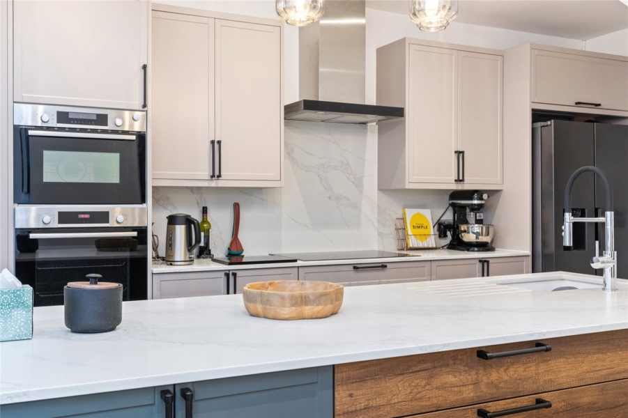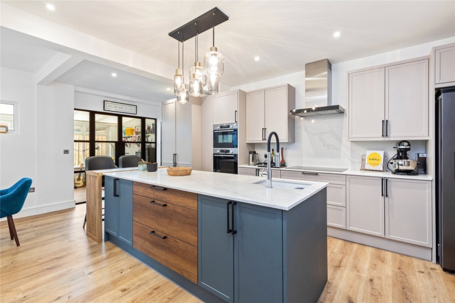 The heart of the home is the beautifully appointed, newly fitted kitchen, designed with both practicality and entertaining in mind. A large central island provides a natural focal point, complemented by generous worktop space and plenty of storage. There is ample room for a large dining table, making this an ideal space for family meals and gatherings.