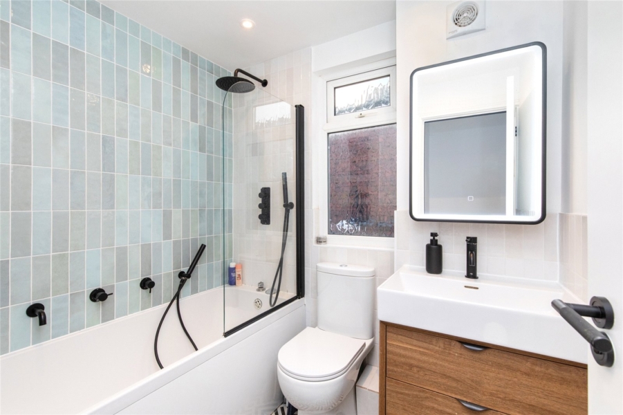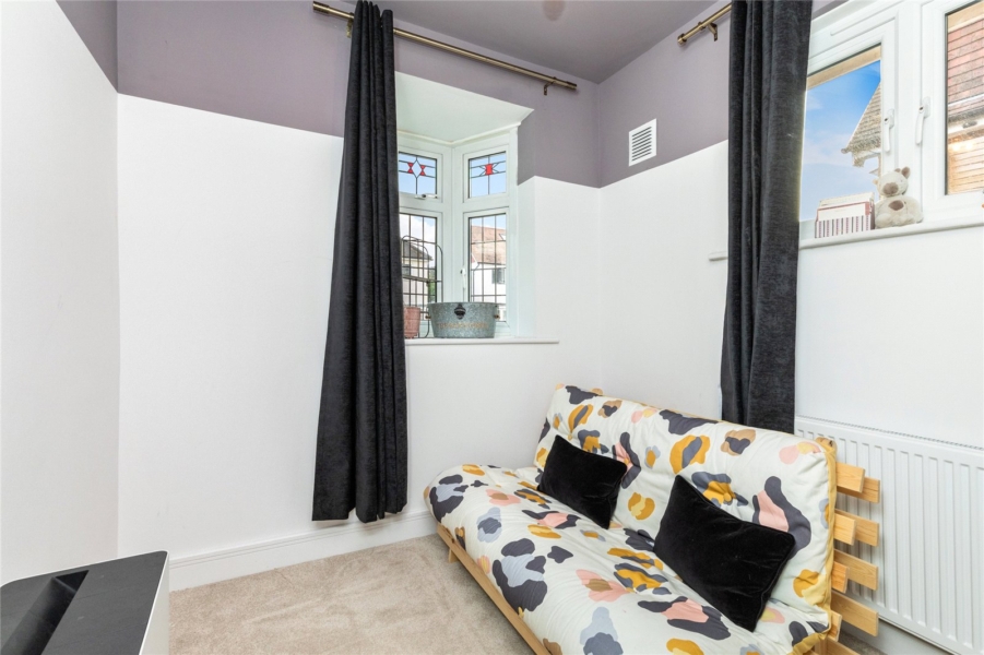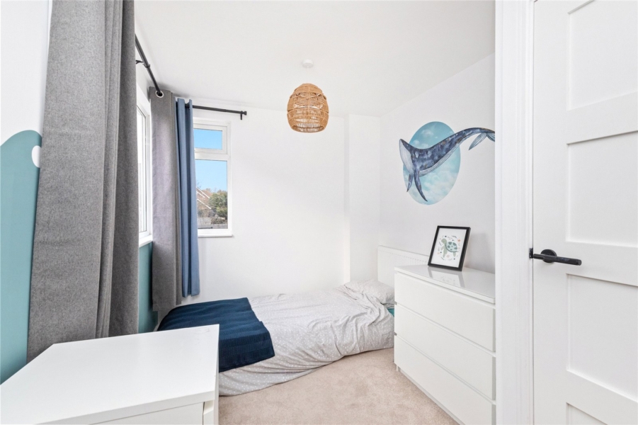 Upstairs, the first floor provides three well-proportioned bedrooms. The principal bedroom is particularly generous in size and benefits from built-in storage, while the remaining double bedrooms are ideal for children, guests or additional workspace.