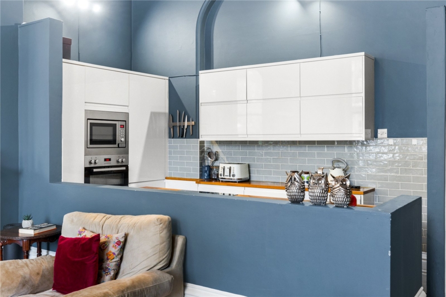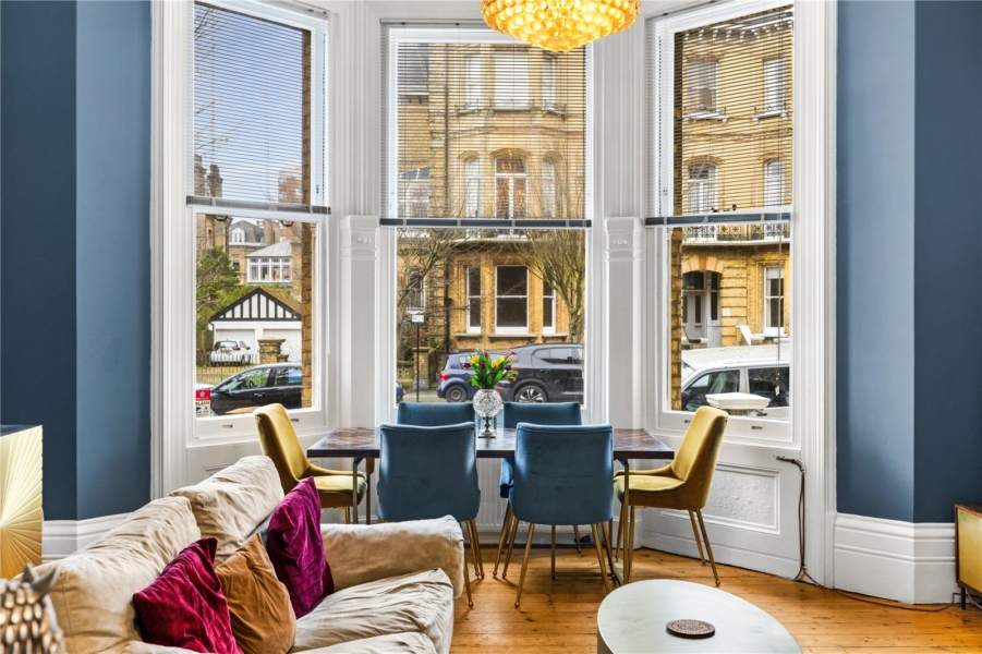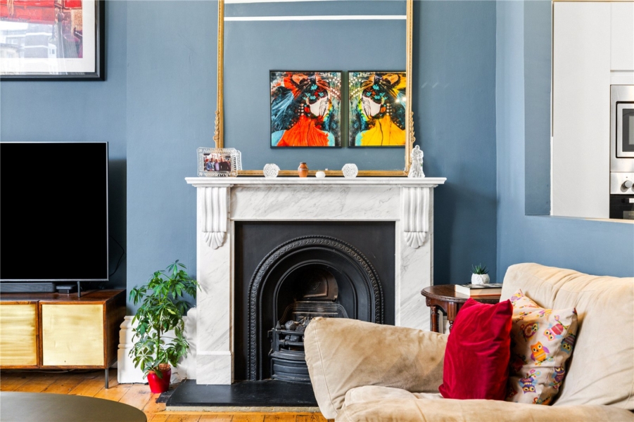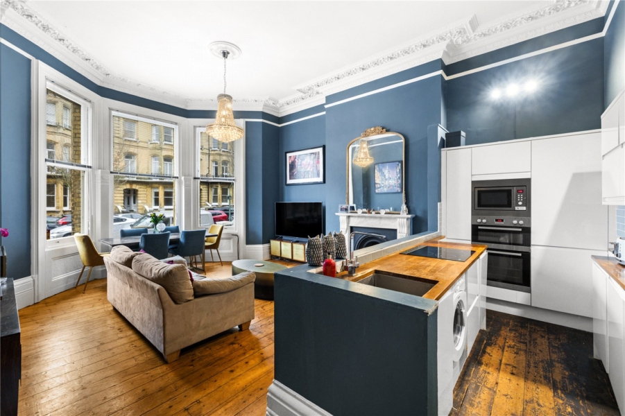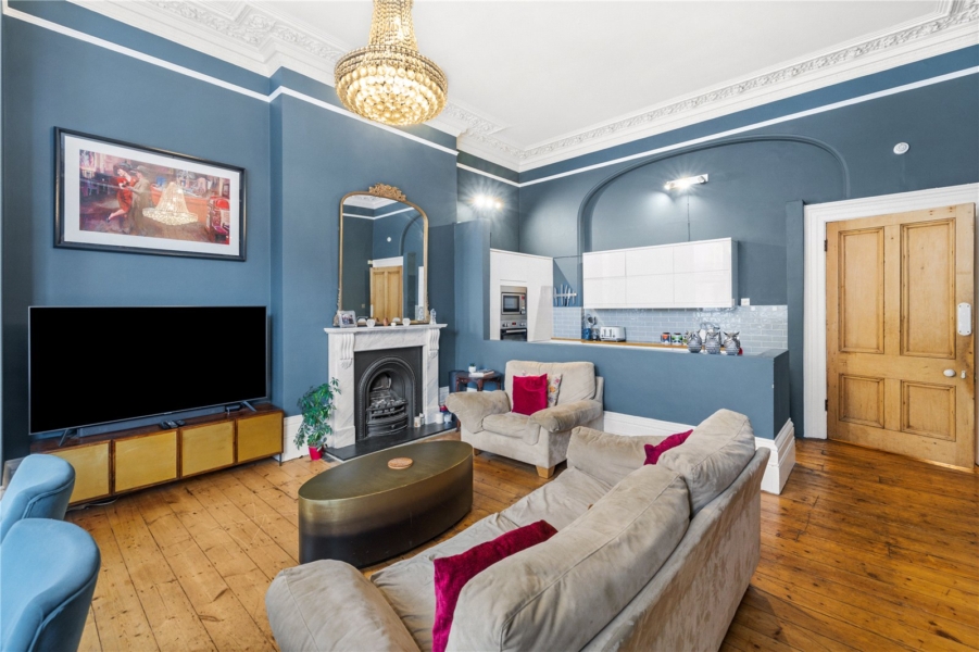 The principal reception room is a striking space, defined by high ceilings, intricate cornicing and beautiful period detailing. Bathed in natural light from tall sash windows, the room effortlessly combines a refined lounging area with a well-appointed kitchen, creating a sociable and versatile setting that is perfectly suited to both everyday living and entertaining.
