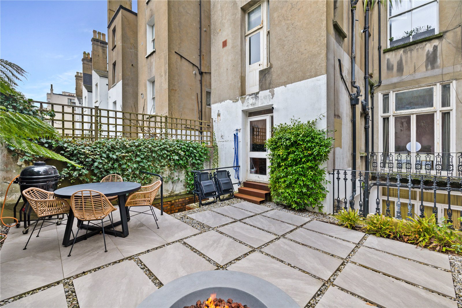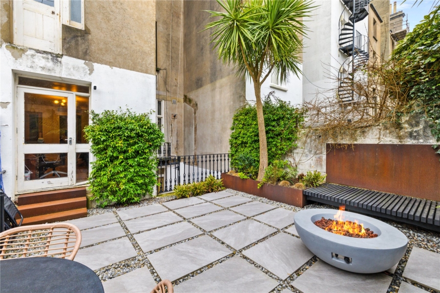 The landscaped garden has been thoughtfully designed, complete with integrated lighting and a fire pit area, offering an inviting space for al fresco dining and relaxed evenings with friends.