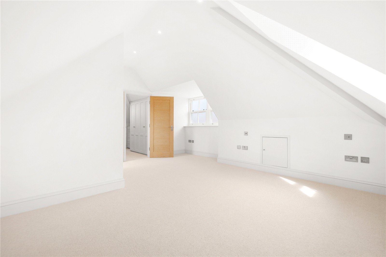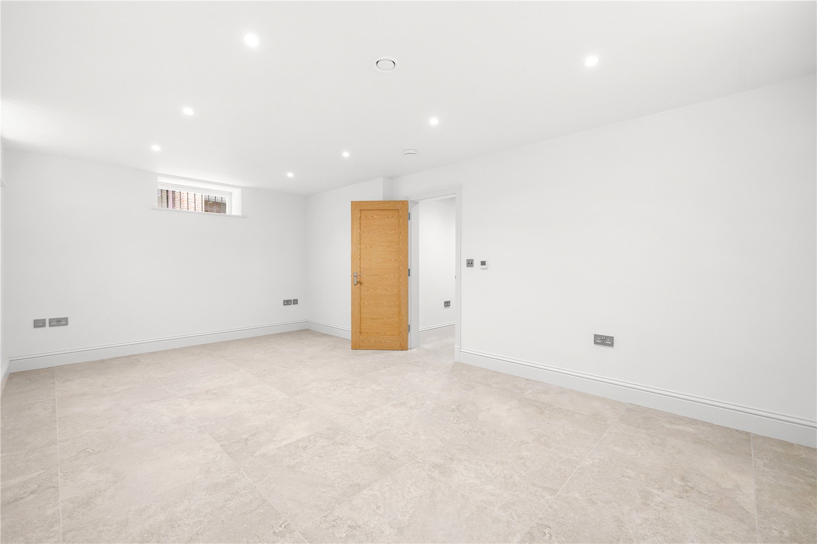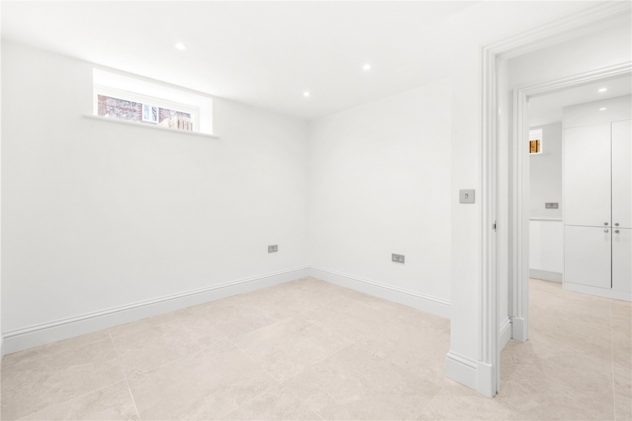 The bedrooms are fitted with luxurious 100% wool carpets, while the ground floor boasts elegant oak flooring, and the lower ground floor is finished with stylish Porcelanosa tiles. Mood lighting enhances the ambiance in both bedroom and living spaces, creating a relaxing environment.