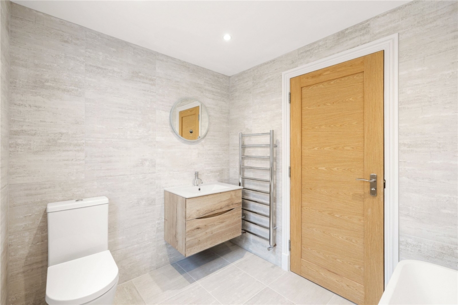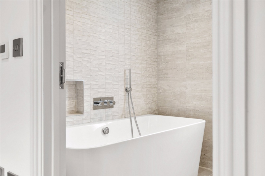 The property features luxurious, fully tiled bathrooms with premium fittings, including walk-in showers, a freestanding bath, and underfloor heating for ultimate comfort. Both principal bedrooms benefit from built-in wardrobes and private en suite bath or shower rooms, adding a touch of luxury to these serene spaces.