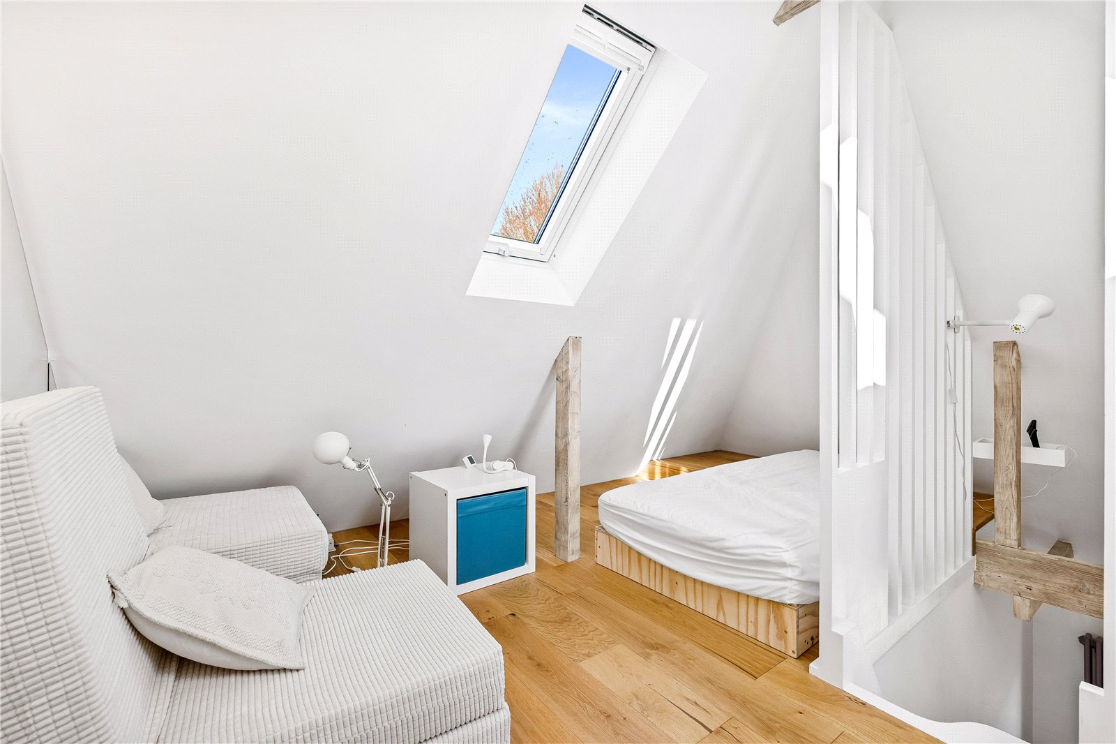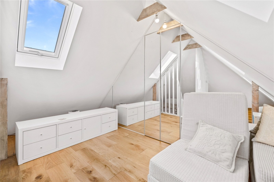 • The Mezzanine Suite: Originally the third bedroom, this space has been architecturally transformed. The ceiling has been opened to create a stunning mezzanine-style sleeping and relaxation area bathed in light from two Velux windows. This room also provides clever access to the remaining loft storage area.