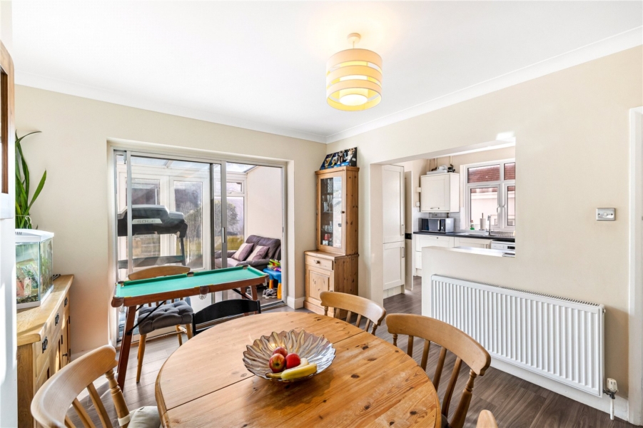 The ground floor features a welcoming entrance hall leading to a bright and airy living room with a distinctive bay window. The dining room sits centrally and flows into a conservatory area, providing an ideal connection to the garden. A well-appointed kitchen, separate utility room and ground-floor WC complete this level.