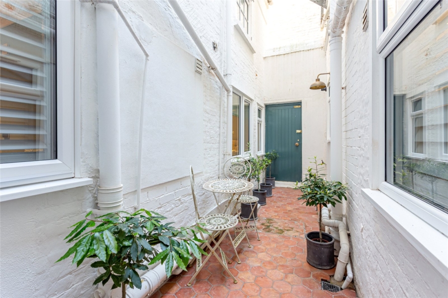 To the rear, a private enclosed courtyard laid with Spanish terracotta tiles offers a peaceful outdoor retreat. Gated access leads to a discreet alleyway connecting to both Norfolk Street and Western Street, adding a sense of seclusion while keeping the city easily within reach.
