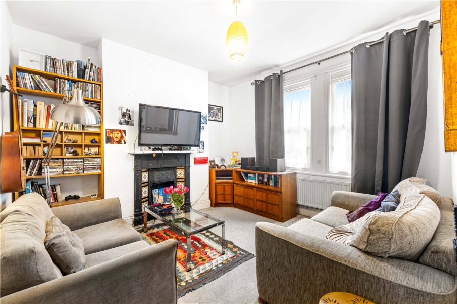 The second floor features a generous living room with space for both seating and dining, alongside a separate fitted kitchen. A spacious double bedroom and a well-presented bathroom sit off the central hallway.