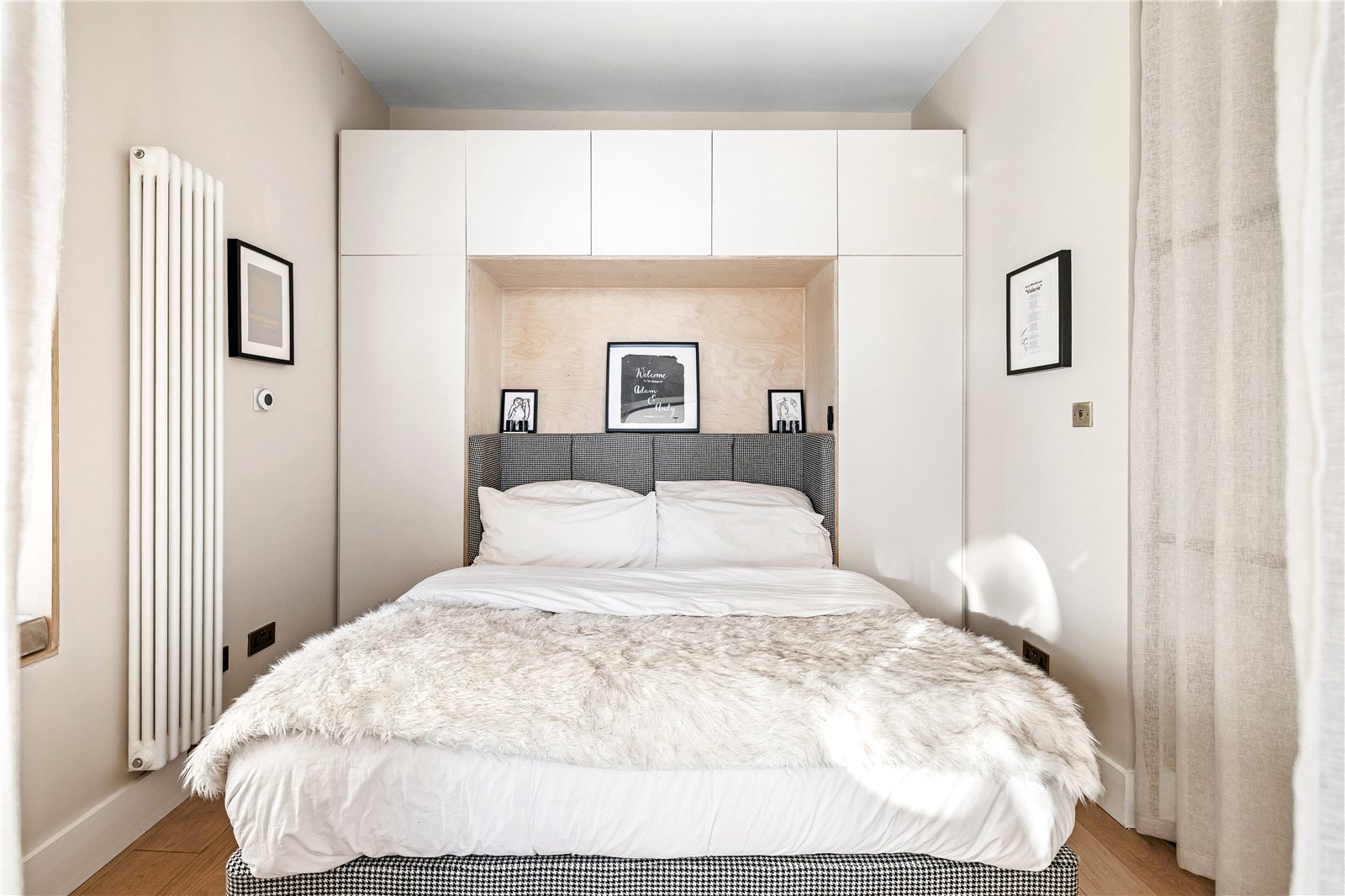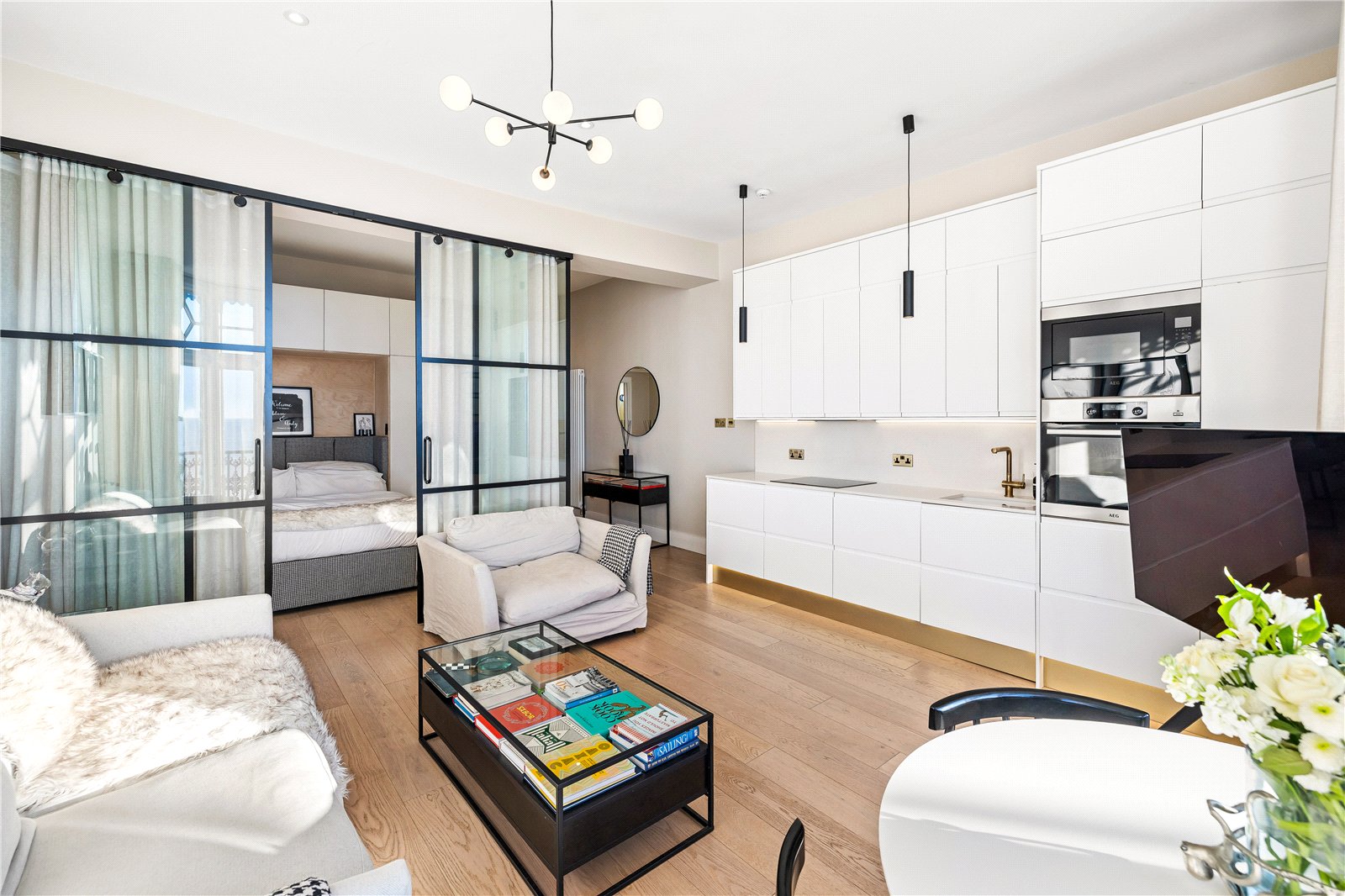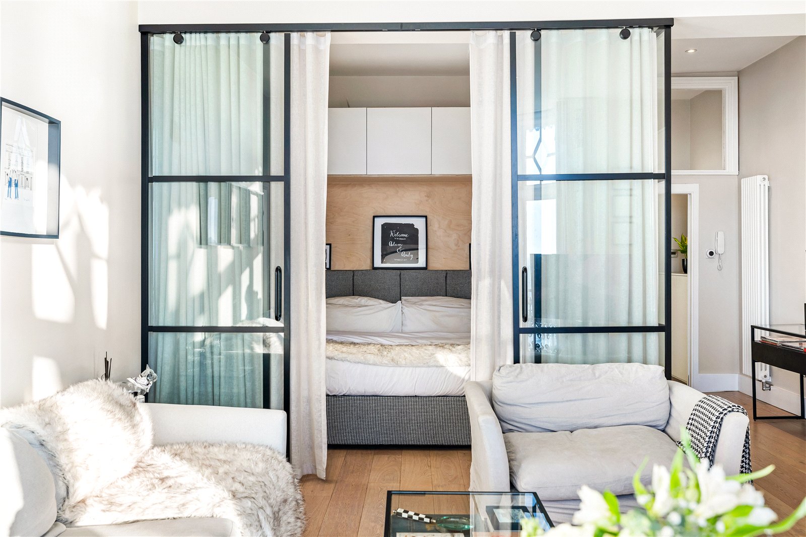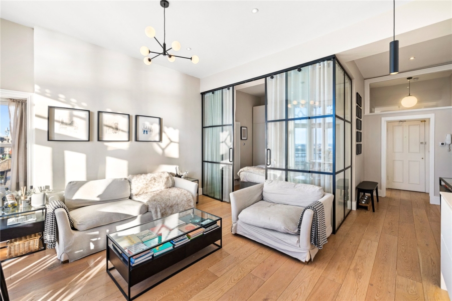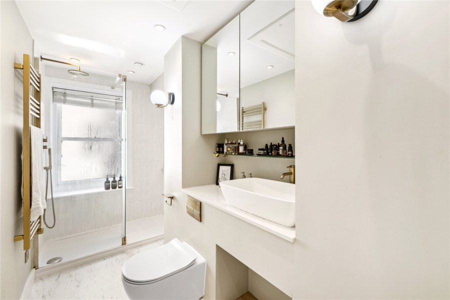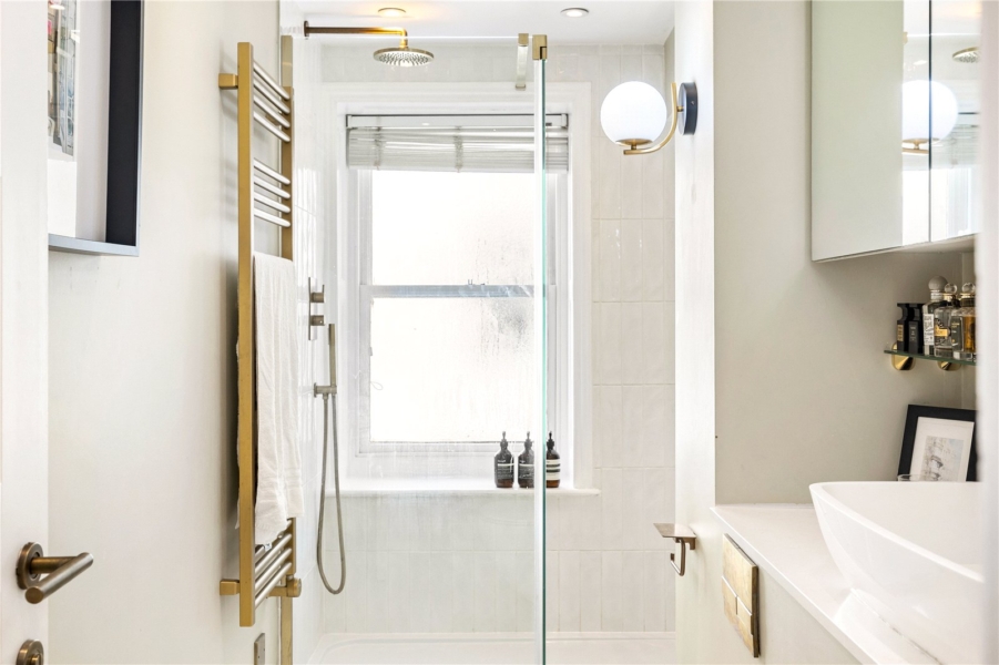 The bedroom offers the wow factor with its bespoke glass walls, enhanced by bespoke built-in wardrobes that maximise space without compromising the apartment’s timeless aesthetic. This sensitive design achieves a perfect harmony between period character and modern upgrades.