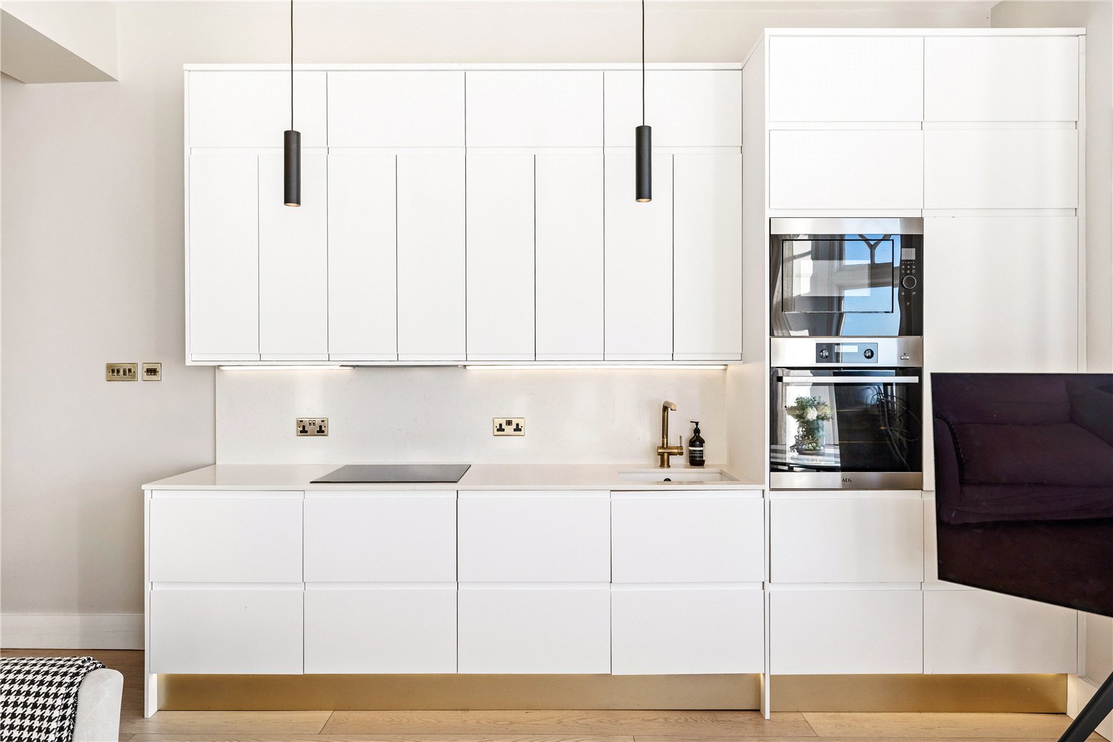 The contemporary kitchen with quartz worktops provides excellent storage and clean, modern lines, while high-spec wooden flooring flows throughout the living areas to create a warm, cohesive atmosphere. The modern bathroom offers large mirrored cabinets, a sleek walk-in shower and a secret laundry room.