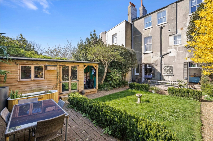 To the rear, there is also a very well built garden room. It is solid and thoughtfully finished with cladding and mains electricity already in place. It works brilliantly as a home office or gym, but really comes into its own as a workspace, with a calm outlook over the garden.
