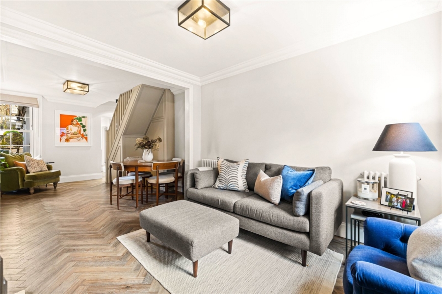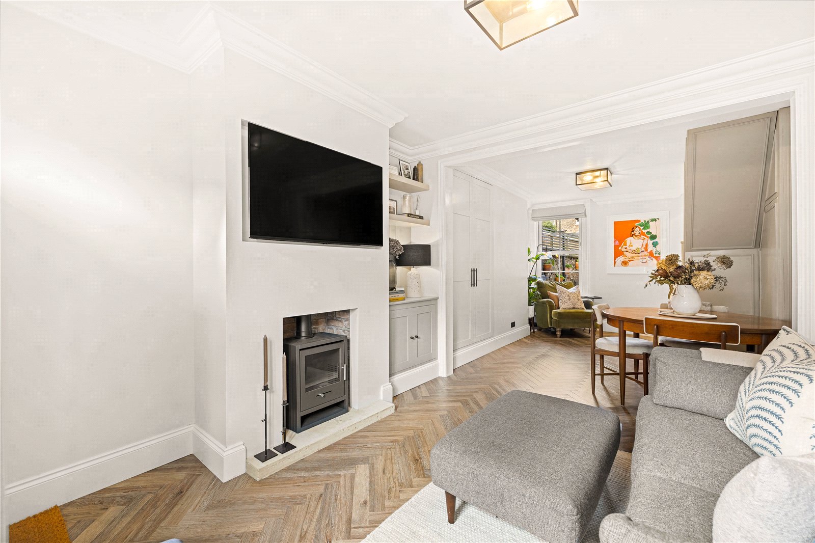 The ground floor provides a welcoming introduction to the home, with a charming living room showcasing period details and a warm, inviting atmosphere. This flows through to a separate dining area, creating an ideal space for entertaining or relaxed family living.