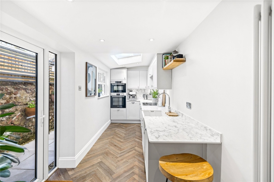 The layout works exceptionally well, offering distinct yet connected living areas that are perfectly suited to modern lifestyles, including those looking to work from home. To the rear, the fitted kitchen is thoughtfully arranged with ample worktop and storage space, combining practicality with everyday functionality.