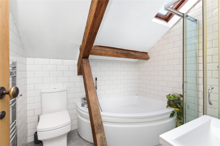 The accommodation comprises three well sized double bedrooms, including a stylish principal suite complete with a modern en suite shower room. The main bathroom is equally well presented, featuring a crisp white suite with both a corner bath and a separate walk in shower, creating a calm and relaxing space.