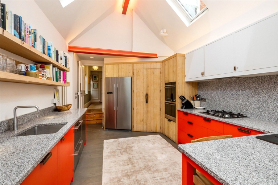 The cabinetry is finished in a rich crimson tone, perfectly complemented by exposed steel elements within the ceiling structure. There is extensive worktop space, a built-in pantry for additional storage and a suite of Fisher and Paykel appliances, all combining to create a kitchen that is as functional as it is visually compelling. A downstairs W.C and understairs storage complete the ground floor.