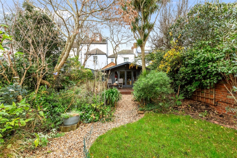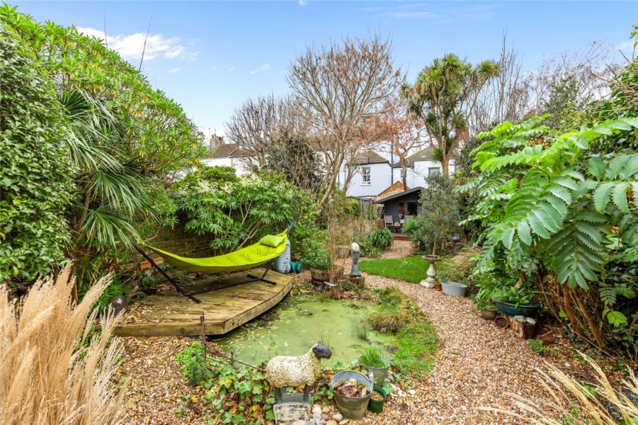 The west facing rear garden has been thoughtfully landscaped to create a secluded and characterful oasis. Long in length, it begins with a substantial patio and side return, with secure gated access ideal for bike storage. The garden then unfolds via a meandering stone path, passing a variety of established planters and flowers and a tranquil pond with decked hammock area.