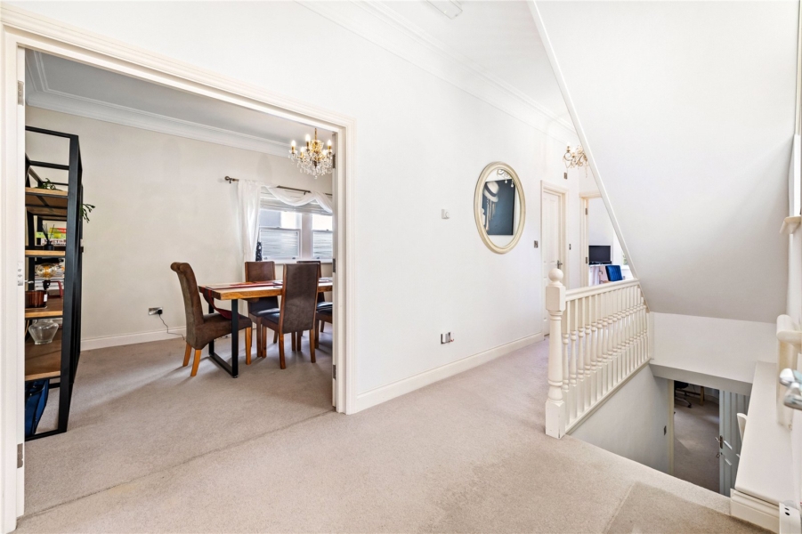 On the first floor, a spacious landing leads to three well proportioned rooms. There is a generous double bedroom, a versatile study, nursery or dressing room, and a modern family bathroom. The principal bedroom is a standout, with excellent built in storage and a sleek ensuite shower room.