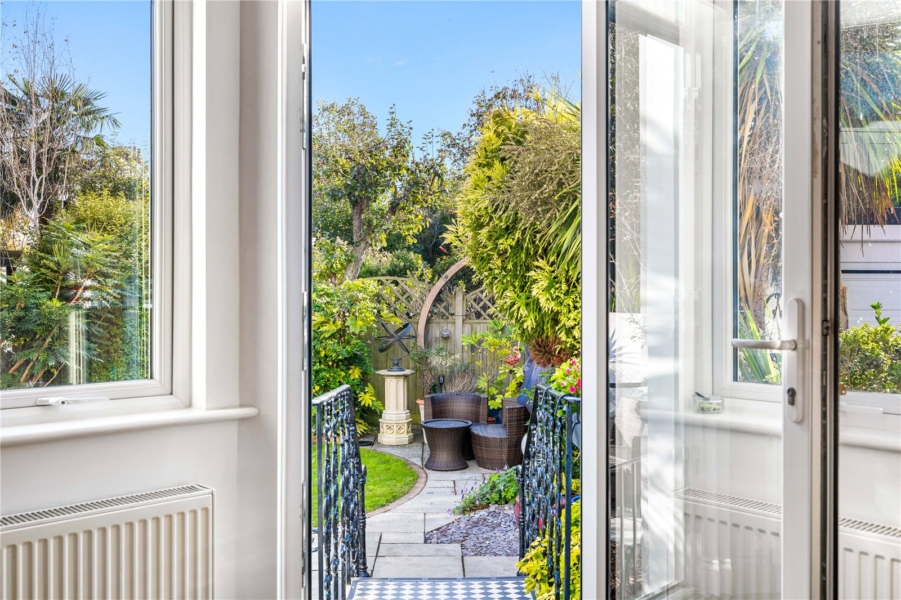 As you step through the porch, the sense of space and scale is immediately apparent. At the front, a wonderfully secluded living room with high ceilings and double glazed sash windows provides a perfect private retreat at the end of the day. Next door, elegant glass French doors open into a formal dining room, an ideal setting for hosting dinners with friends and family.