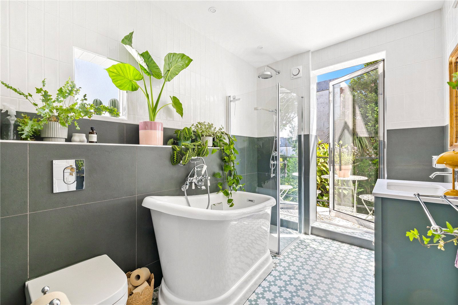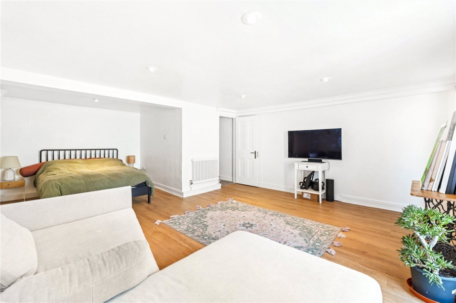 The lower ground floor offers a versatile and private suite comprising a large bedroom and a stylish Parisian-inspired bathroom. This flexible space is ideal as a principal bedroom, guest suite or additional living area, and is complemented by a substantial storage room on the same level.