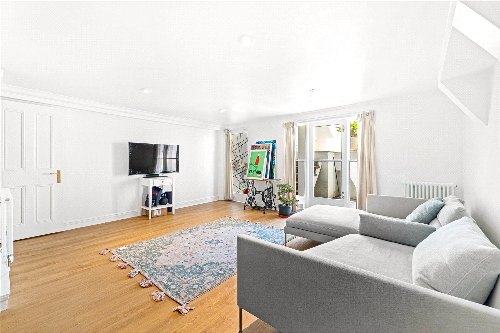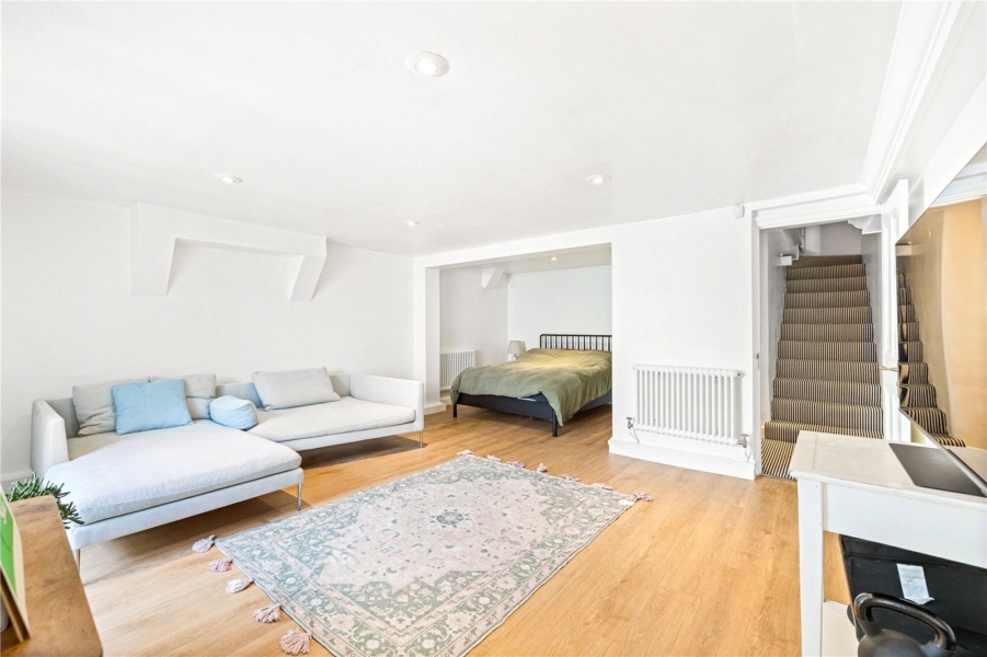 On the upper floors, the sense of space and quality continues. The first floor features two generous double bedrooms with built-in wardrobes, alongside a beautifully finished family bathroom which enjoys access to a private balcony. The principal bedroom, located at the front of the house, benefits from an expansive layout and charming views over this sought-after street. The top floor provides a further flexible room, well suited as a home office, guest bedroom or creative studio, with ample eaves storage.