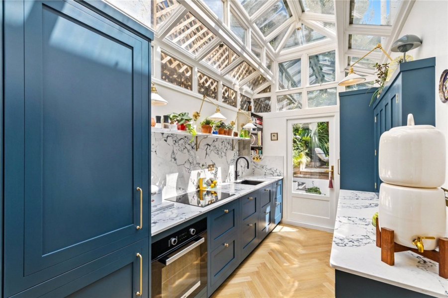 The ground floor provides a stunning through living and dining space, filled with natural light and enhanced by high ceilings, wood flooring and a feature fireplace, creating an inviting environment for both everyday living and entertaining. To the rear, set beneath an impressive glass orangery roof, is the exceptional Harvey Jones kitchen. This beautifully designed space is flooded with light, flows seamlessly from the dining area and offers direct access to a private, mature patio garden. A useful utility room with excellent storage and a separate WC complete the ground floor accommodation.
