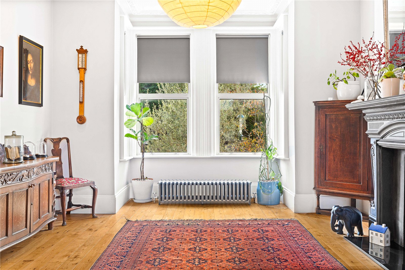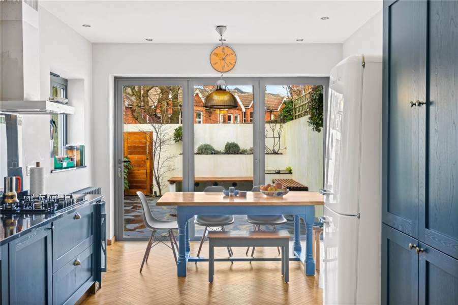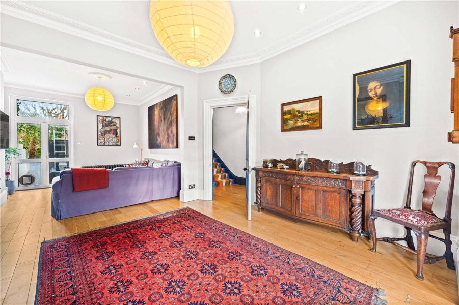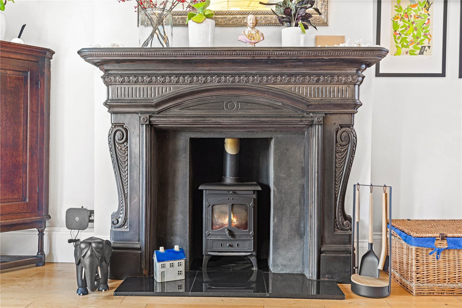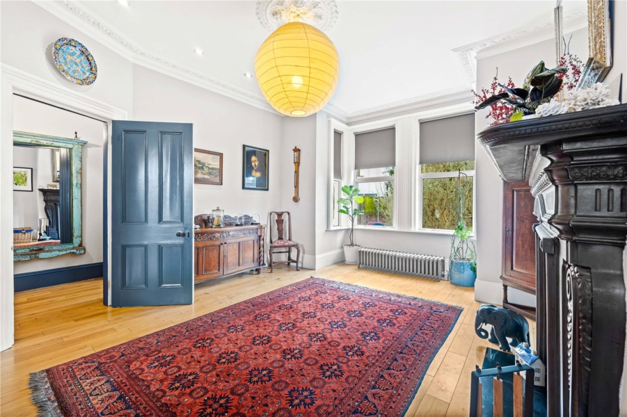 The ground floor is both impressive and welcoming, featuring a generous through lounge and dining area with high ceilings, original radiators, elegant period features and a striking feature fireplace complete with a log burner. To the rear, a high-end, modern kitchen has been recently fitted and opens seamlessly via bi-fold doors onto a landscaped patio garden, ideal for entertaining and indoor-outdoor living.