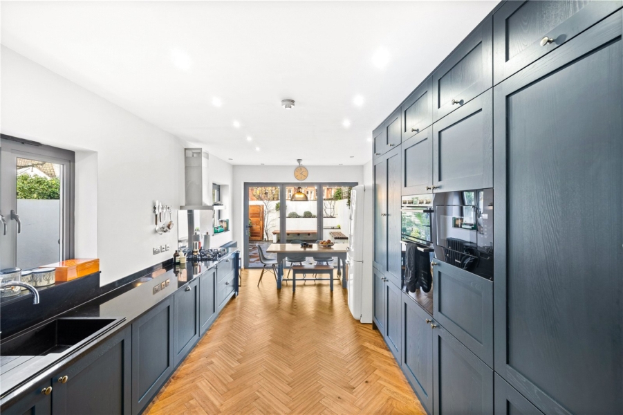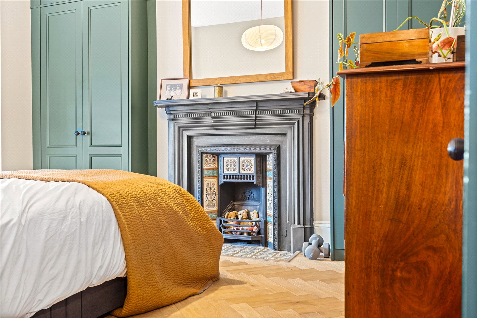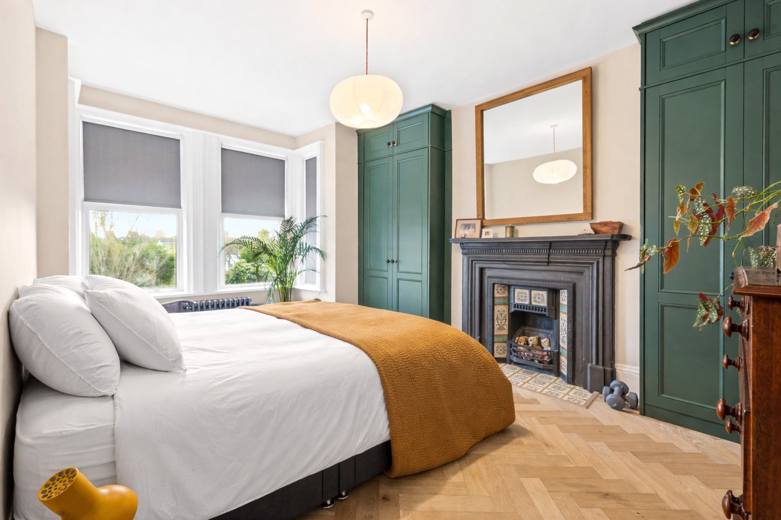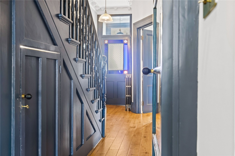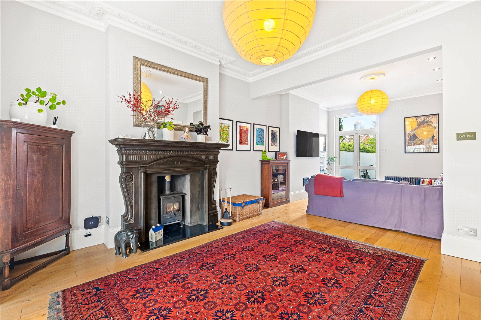 The ground floor is both impressive and welcoming, featuring a generous through lounge and dining area with high ceilings, original radiators, elegant period features and a striking feature fireplace complete with a log burner. To the rear, a high-end, modern kitchen has been recently fitted and opens seamlessly via bi-fold doors onto a landscaped patio garden, ideal for entertaining and indoor-outdoor living.