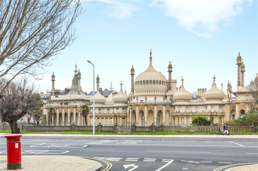 Accessed via an impressive sweeping marble staircase, the apartment immediately showcases its grand scale and architectural presence. The expansive living and dining room forms the heart of the home, offering a remarkable living space with towering ceilings and beautiful original sash windows that flood the room with natural light throughout the day. From here, there are also charming glimpses towards the famous Royal Pavilion, further enhancing the property’s distinctive appeal.