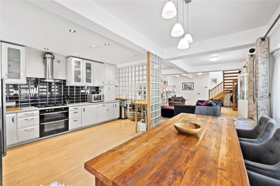 Upon entering at ground level, you are welcomed into a wonderful open plan living and dining space that immediately showcases the home’s charm and character. This expansive room provides a versatile and inviting environment, perfect for both everyday living and entertaining. To the far end, a modern semi open plan kitchen blends seamlessly with the living area and is fitted with all the usual appliances, offering both practicality and style. Also on this level is the fourth bedroom, a well proportioned double room complete with its own en suite bathroom, making it ideal for guests, a home office, or flexible additional living space.