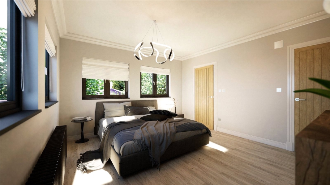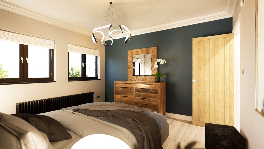 The heart of each home features a sleek dark blue kitchen complemented by warm oak worktops, creating a harmonious blend of modern aesthetics and natural warmth. High-quality appliances are included, ensuring both style and functionality.