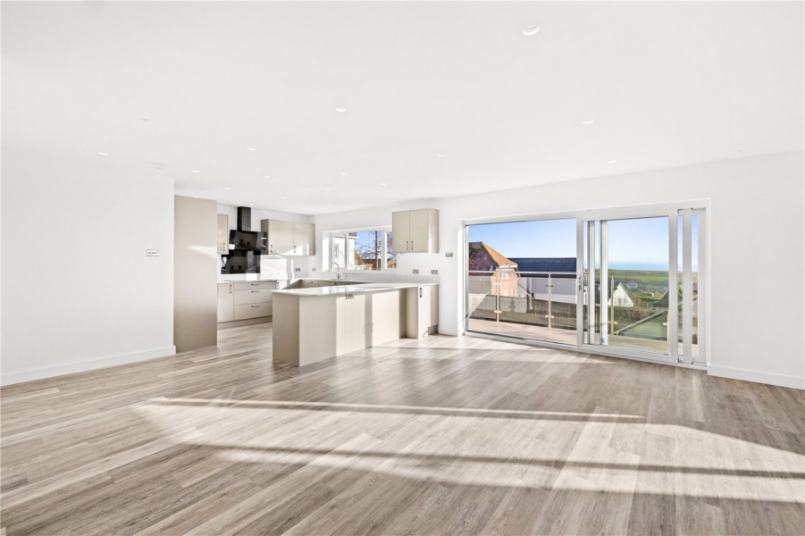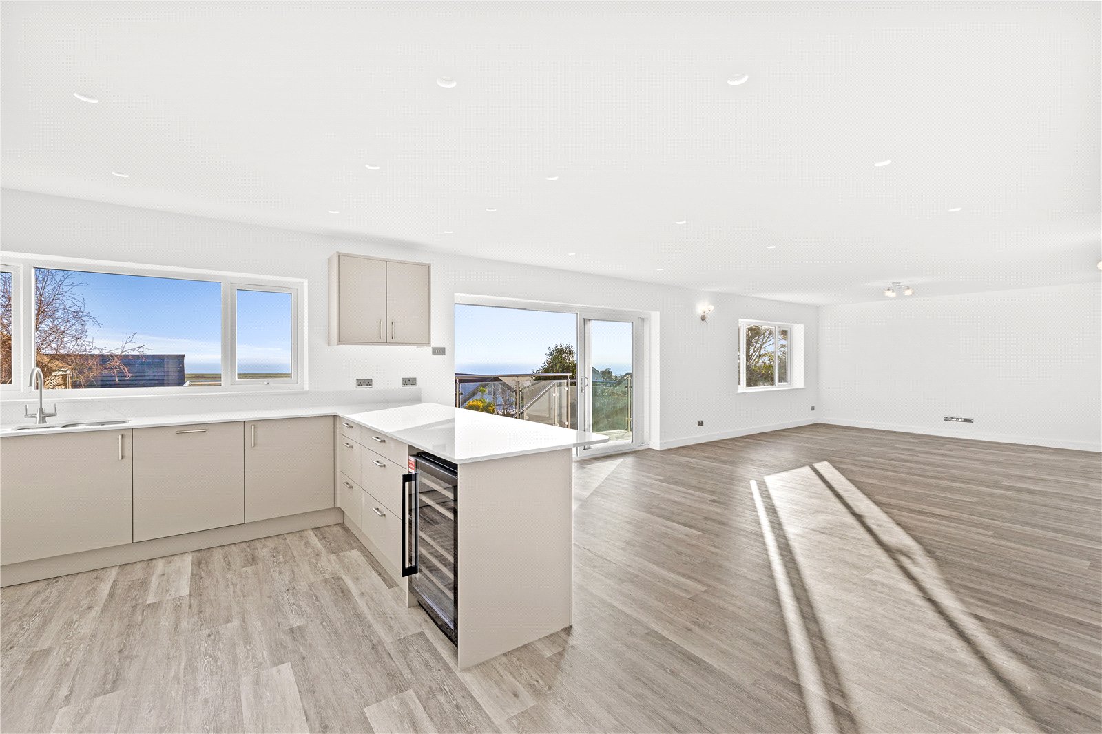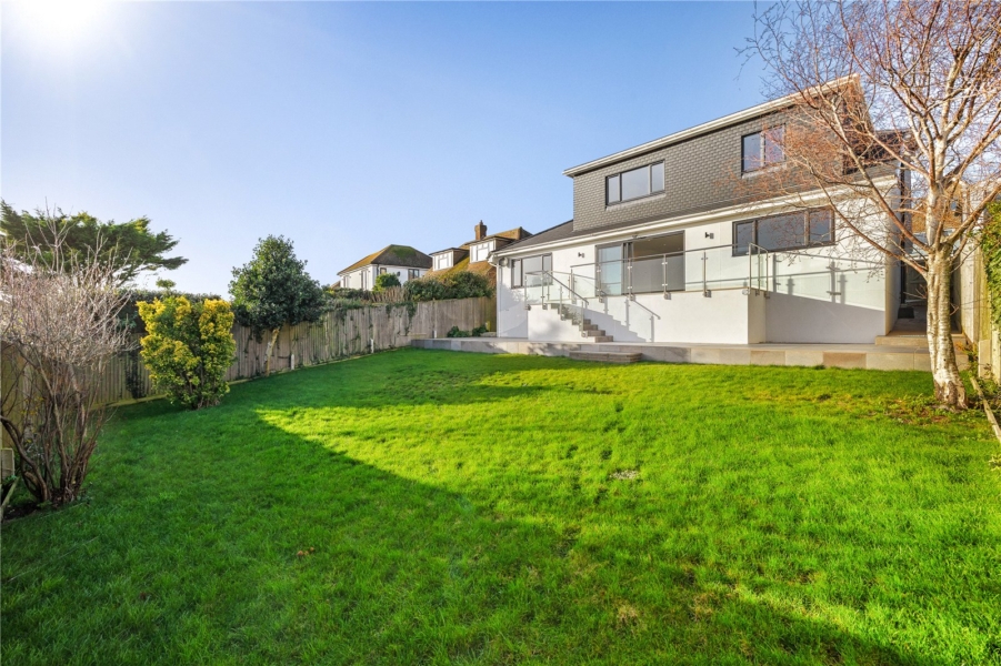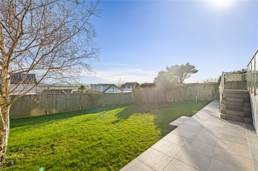 At the heart of the home is a superb open-plan kitchen, living and dining space, thoughtfully designed for modern family life and entertaining. Flooded with natural light, this impressive room opens directly onto the outside seating area, with steps leading down to a large garden that enjoys attractive sea views, creating a seamless connection between indoor and outdoor living.