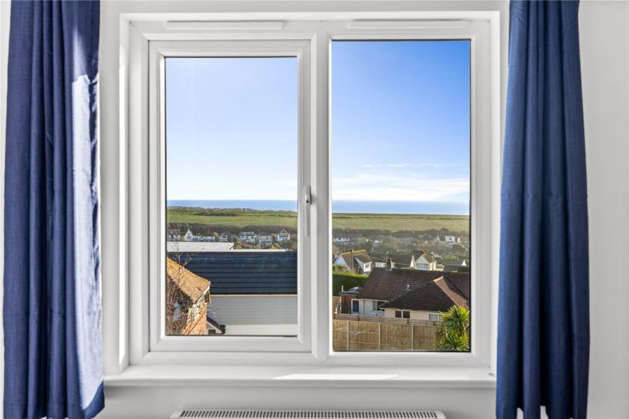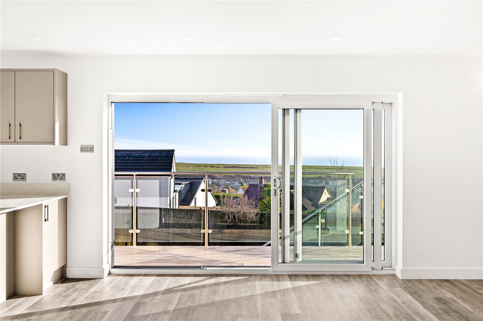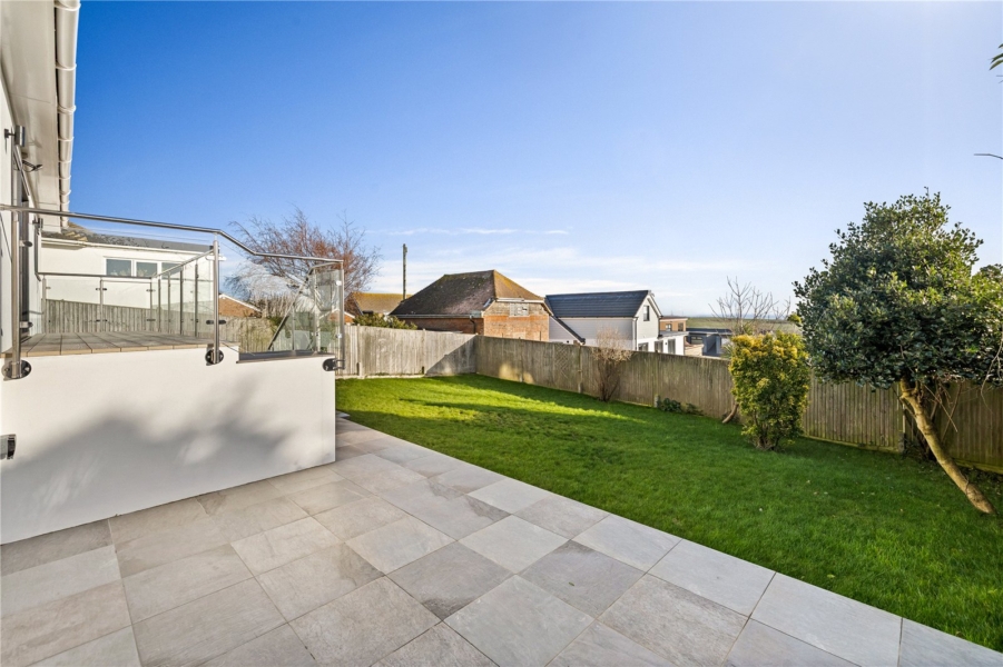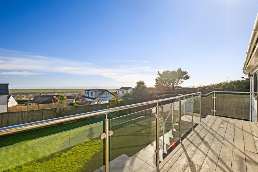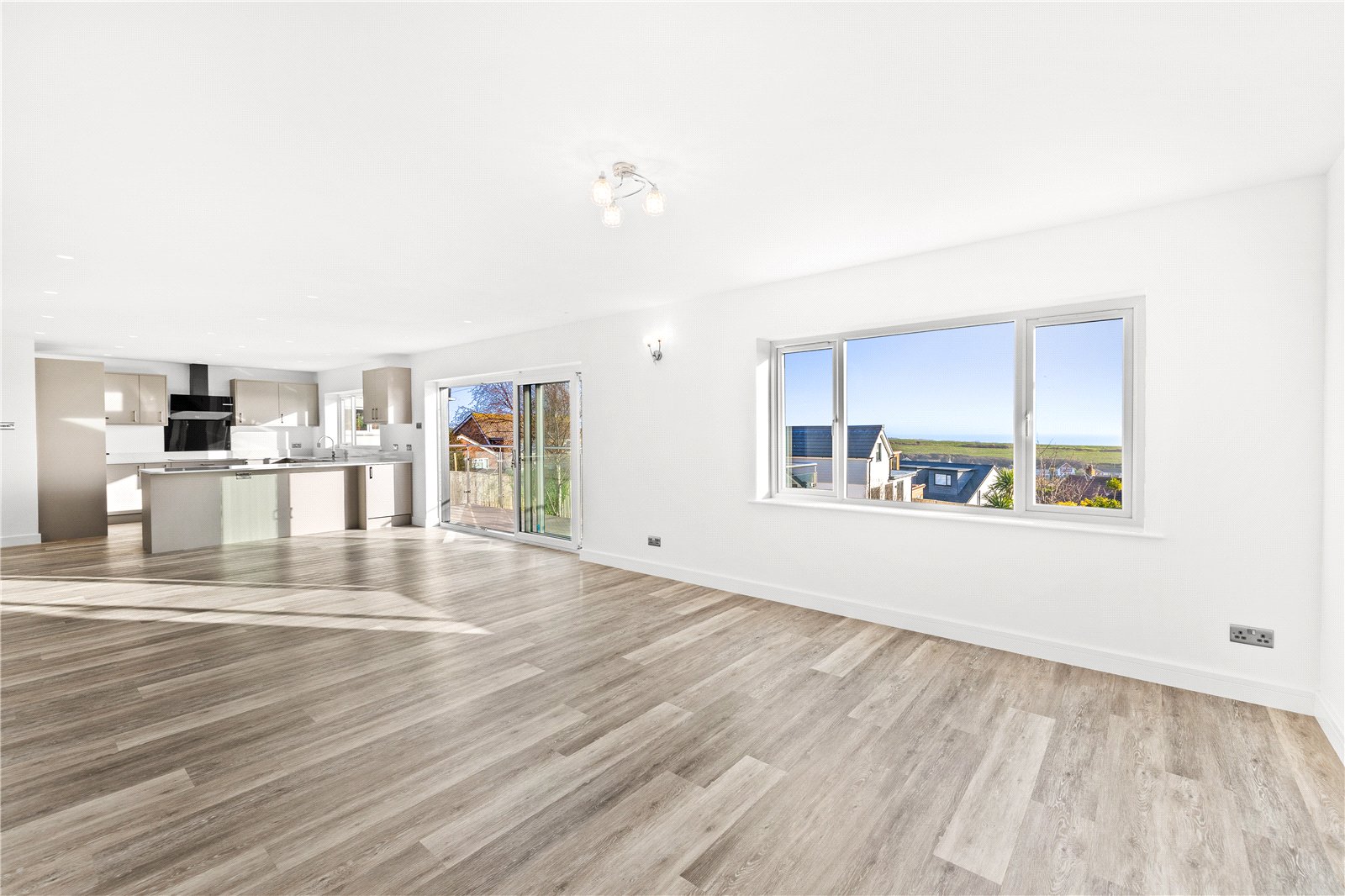 At the heart of the home is a superb open-plan kitchen, living and dining space, thoughtfully designed for modern family life and entertaining. Flooded with natural light, this impressive room opens directly onto the outside seating area, with steps leading down to a large garden that enjoys attractive sea views, creating a seamless connection between indoor and outdoor living.