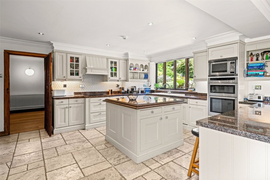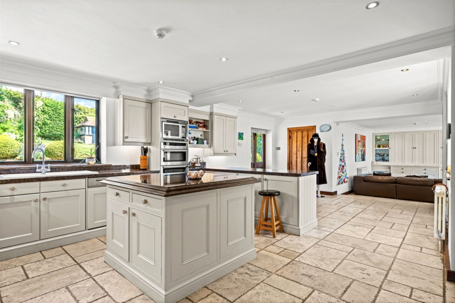 The heart of the home lies in its kitchen – crafted with bespoke cabinetry, granite worktops, and a central island designed for both style and functionality. It steps down into a spacious family area, ideal for everyday living and entertaining. A well-equipped utility room offers further convenience, with doors leading directly out to the garden.