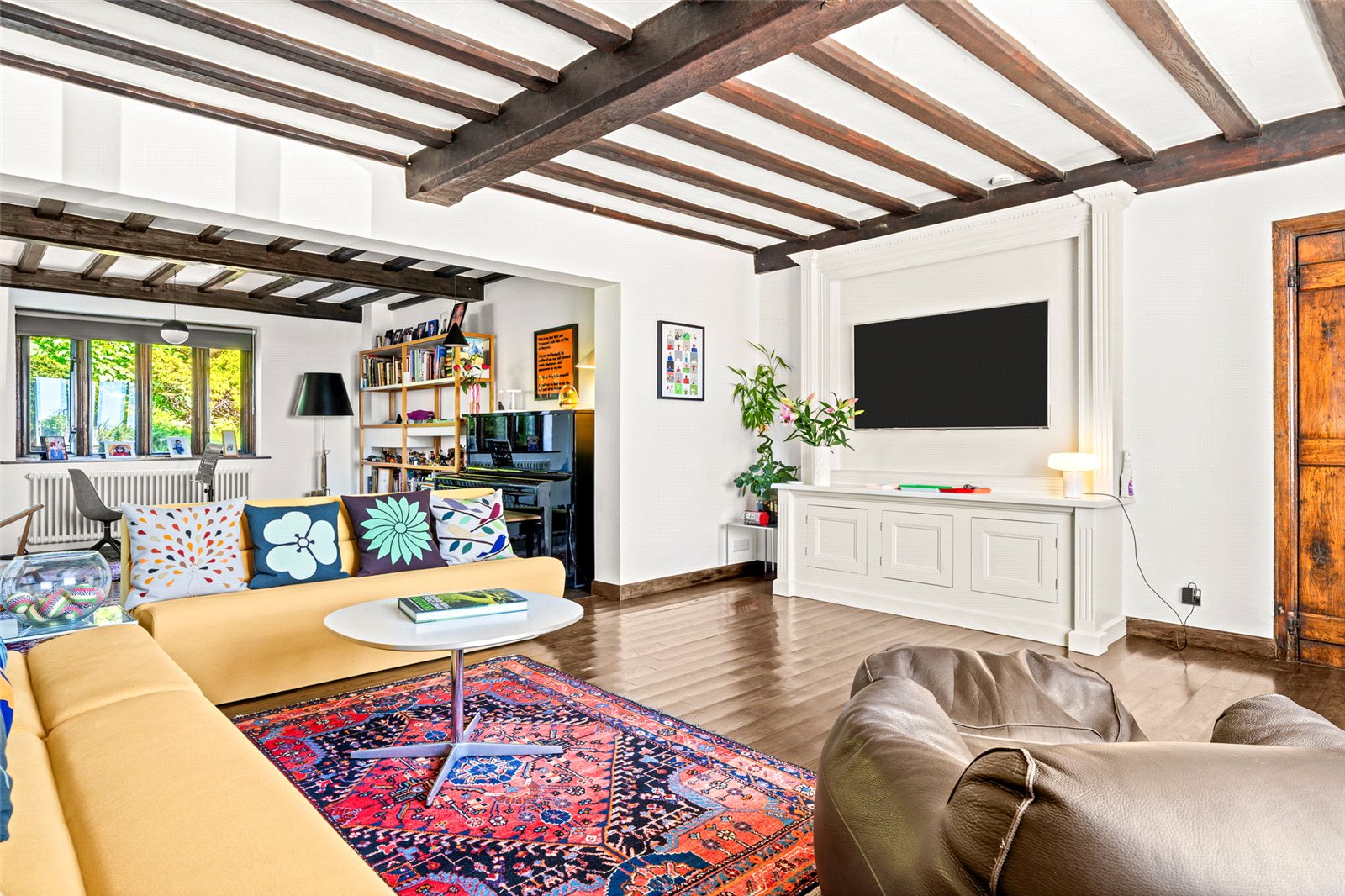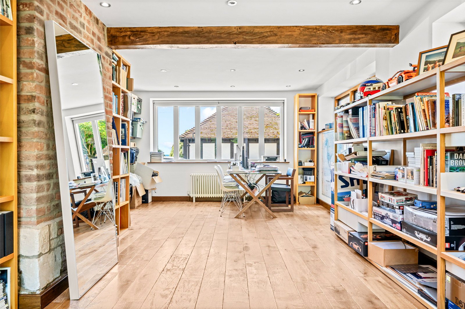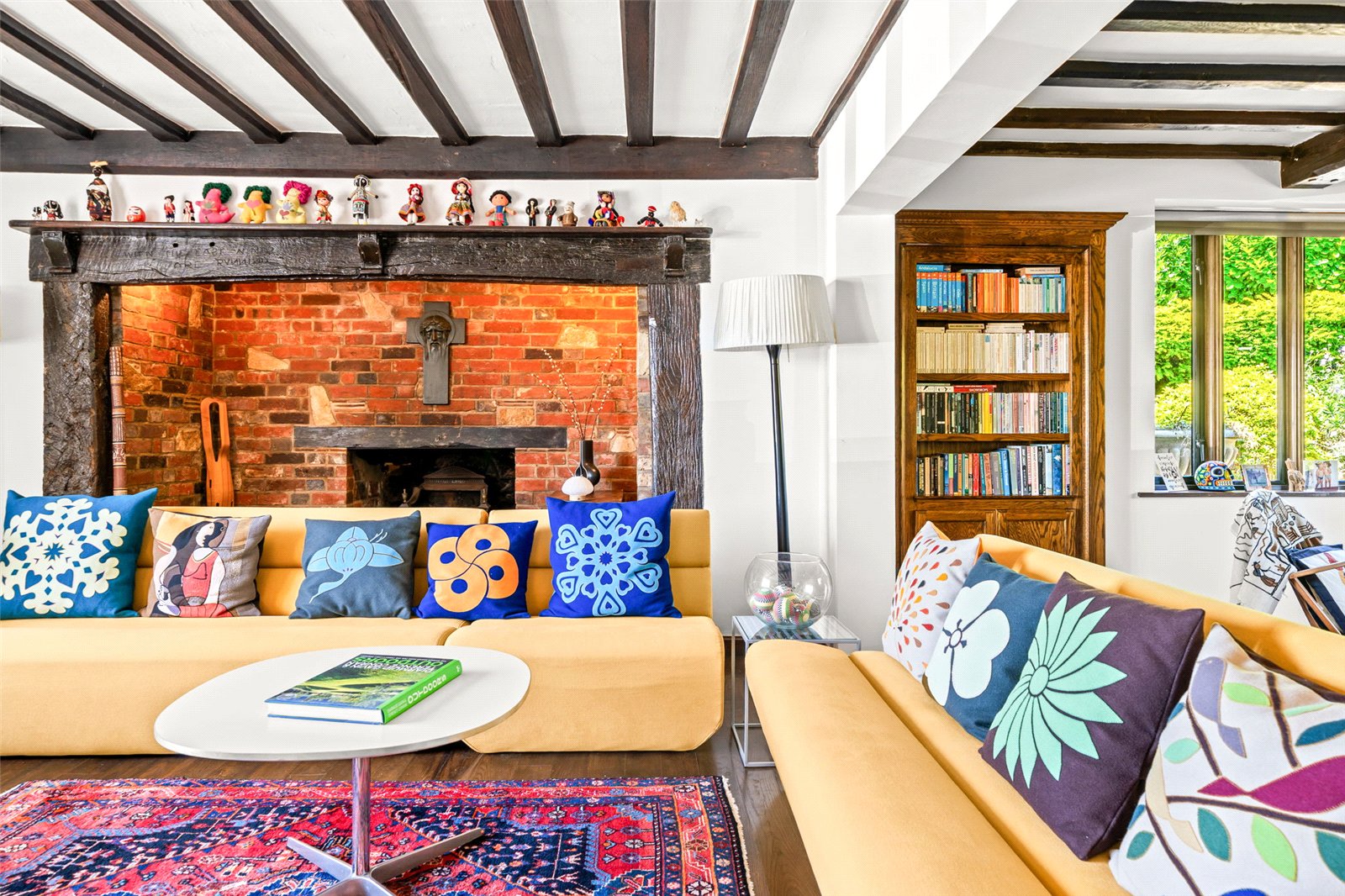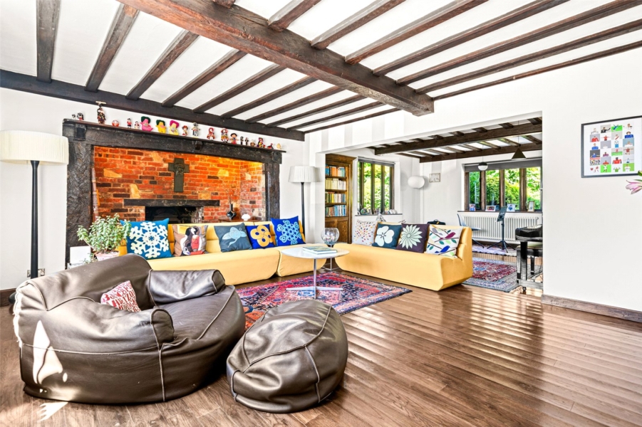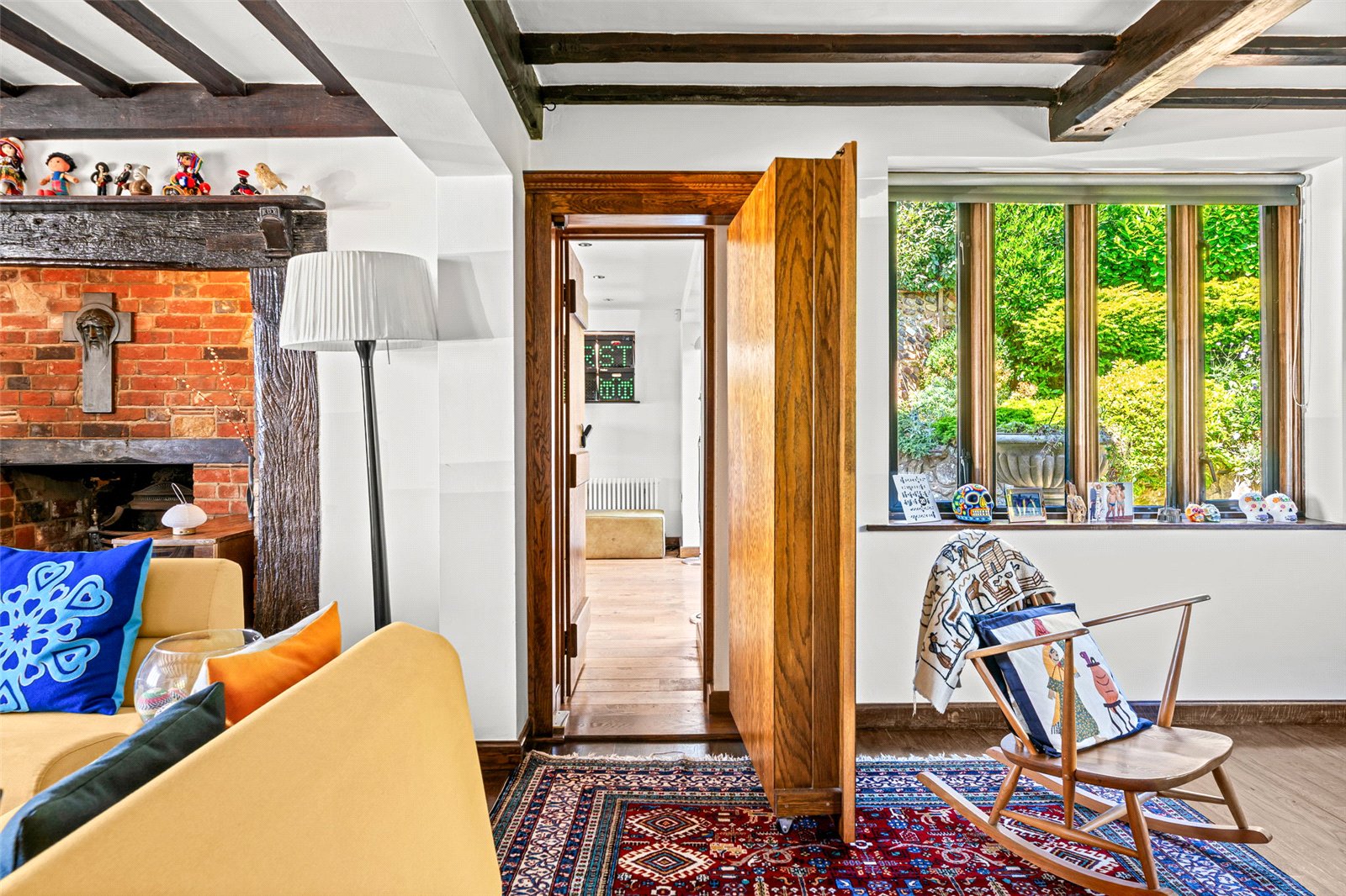 The main living room is both striking and inviting, with a grand inglenook fireplace as the centrepiece. To the rear, the room extends further into a tranquil space, perfect for reading, studying or playing music. Discreetly concealed within this room is a secret door leading to a private study, ideal for a home office, complete with French doors opening onto the landscaped gardens.