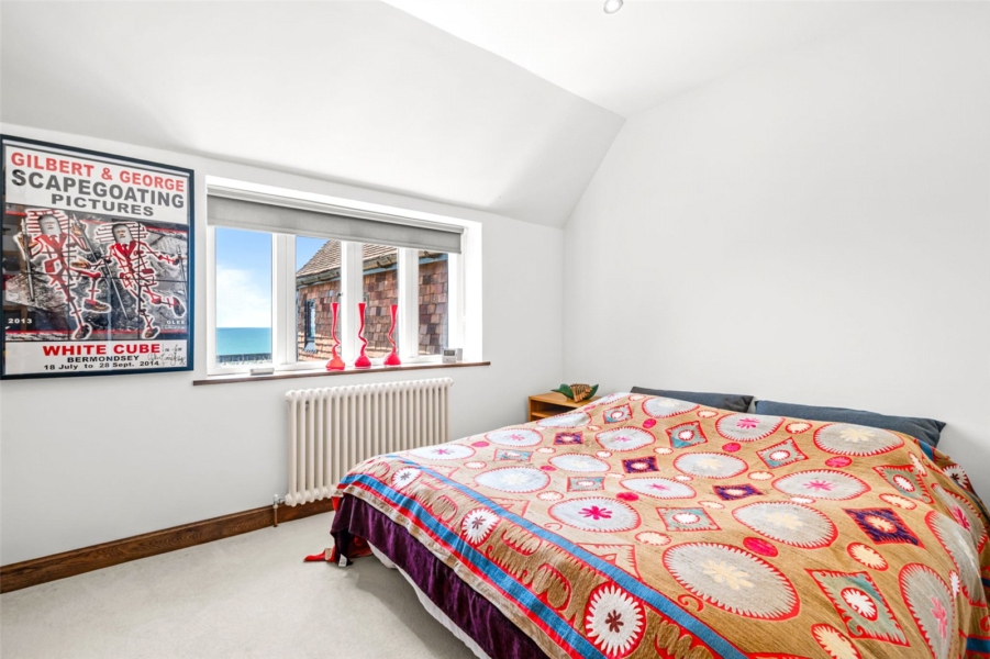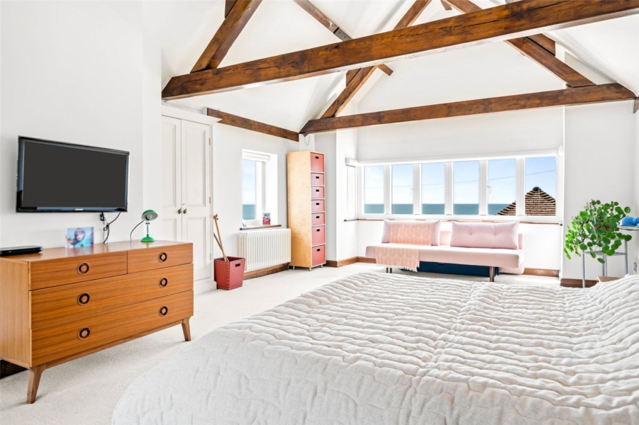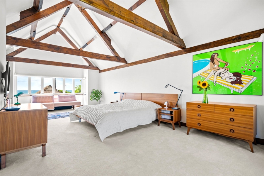 Upstairs, a sweeping oak staircase leads to a broad, light-filled landing. The principal suite is a true retreat – beginning with a dressing area and opening into a vaulted-ceiling bedroom with expansive windows that frame breathtaking views of the sea and gardens. The en-suite bathroom is finished to a high standard, offering true indulgence.