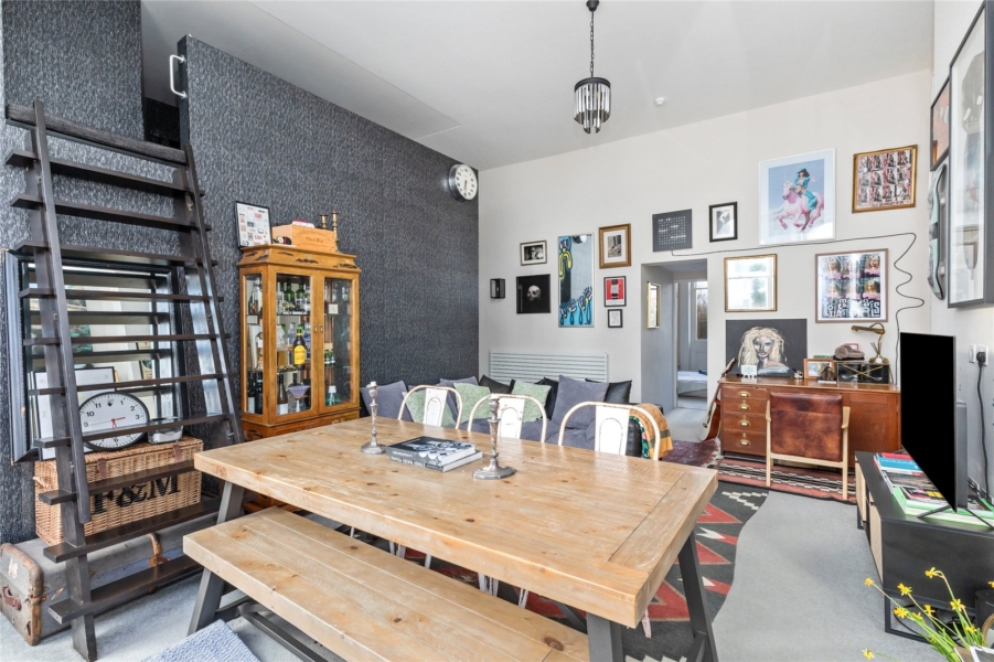 The main living space is a real highlight. With three large bay windows, it is bathed in light throughout the day, particularly in the mornings, and comfortably accommodates a distinct lounge, dining and home office zone, underlining just how generous the room is. From here, there is access to a balcony, adding a lovely coastal feel to the space. A mezzanine level above the kitchen provides excellent additional storage or a handy spot for an occasional guest.