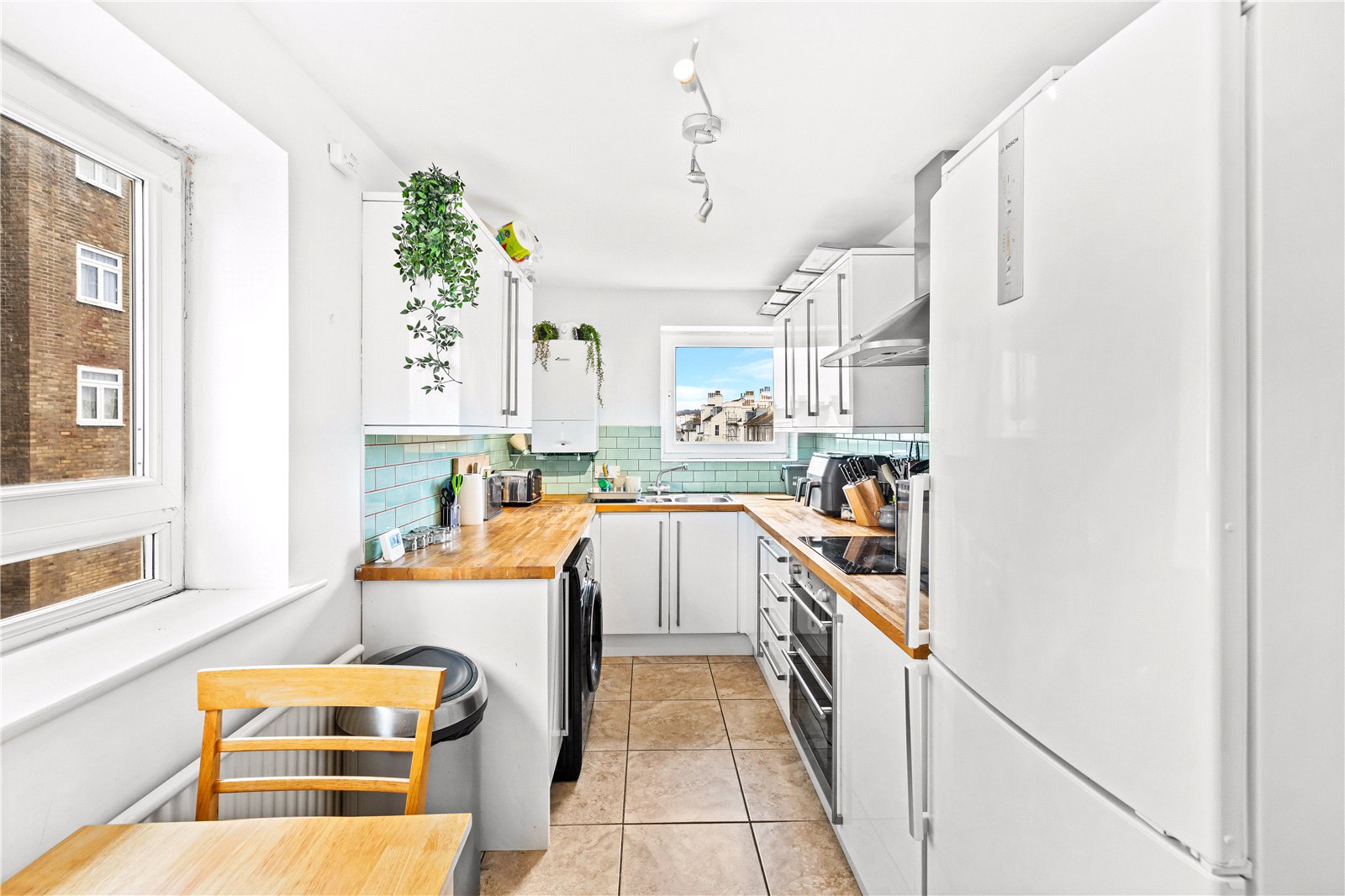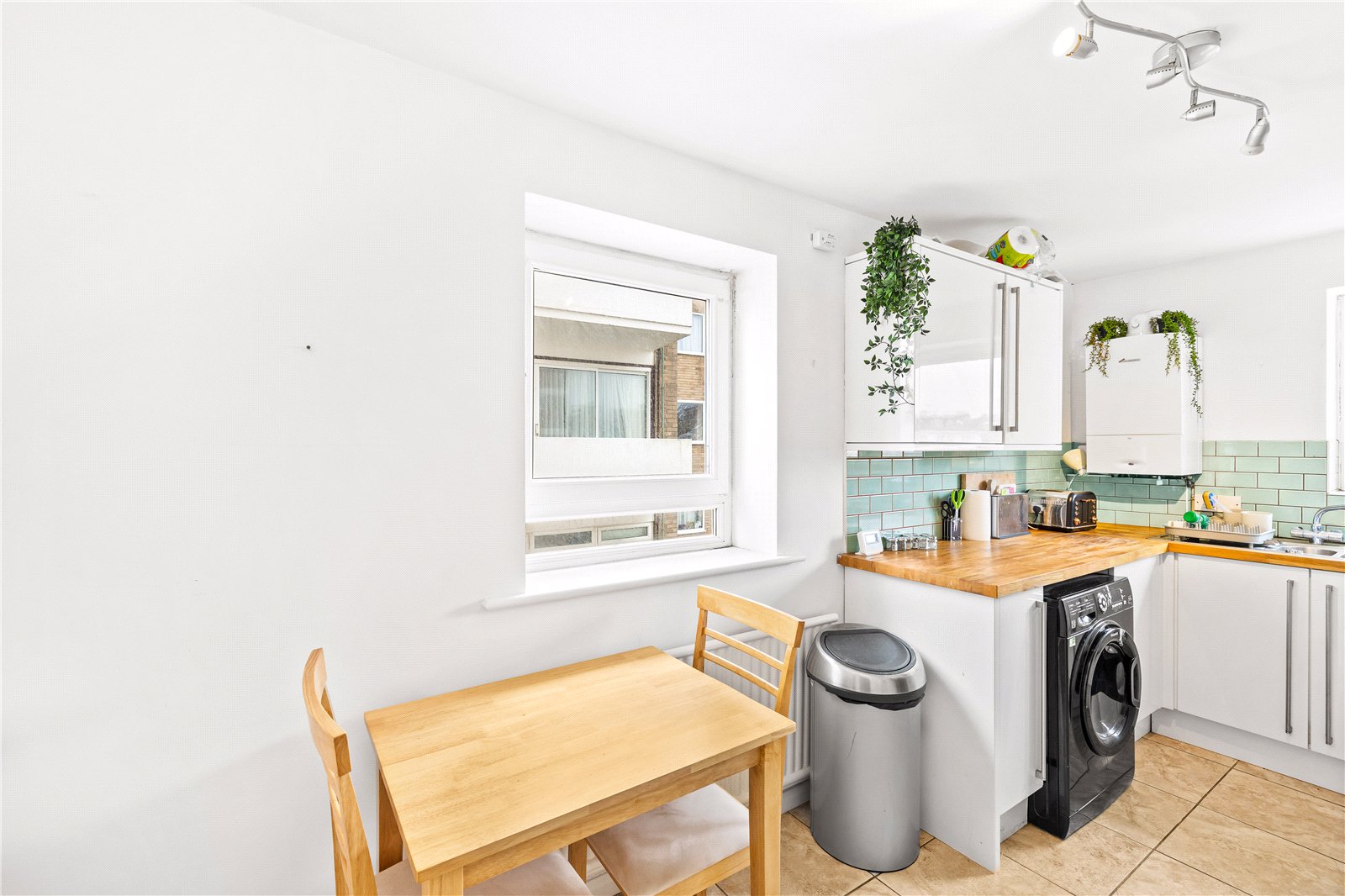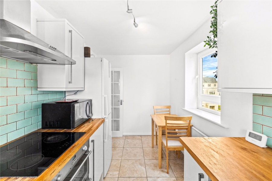 A separate kitchen/dining room sits adjacent, offering practical worktop and storage space along with room for informal dining.