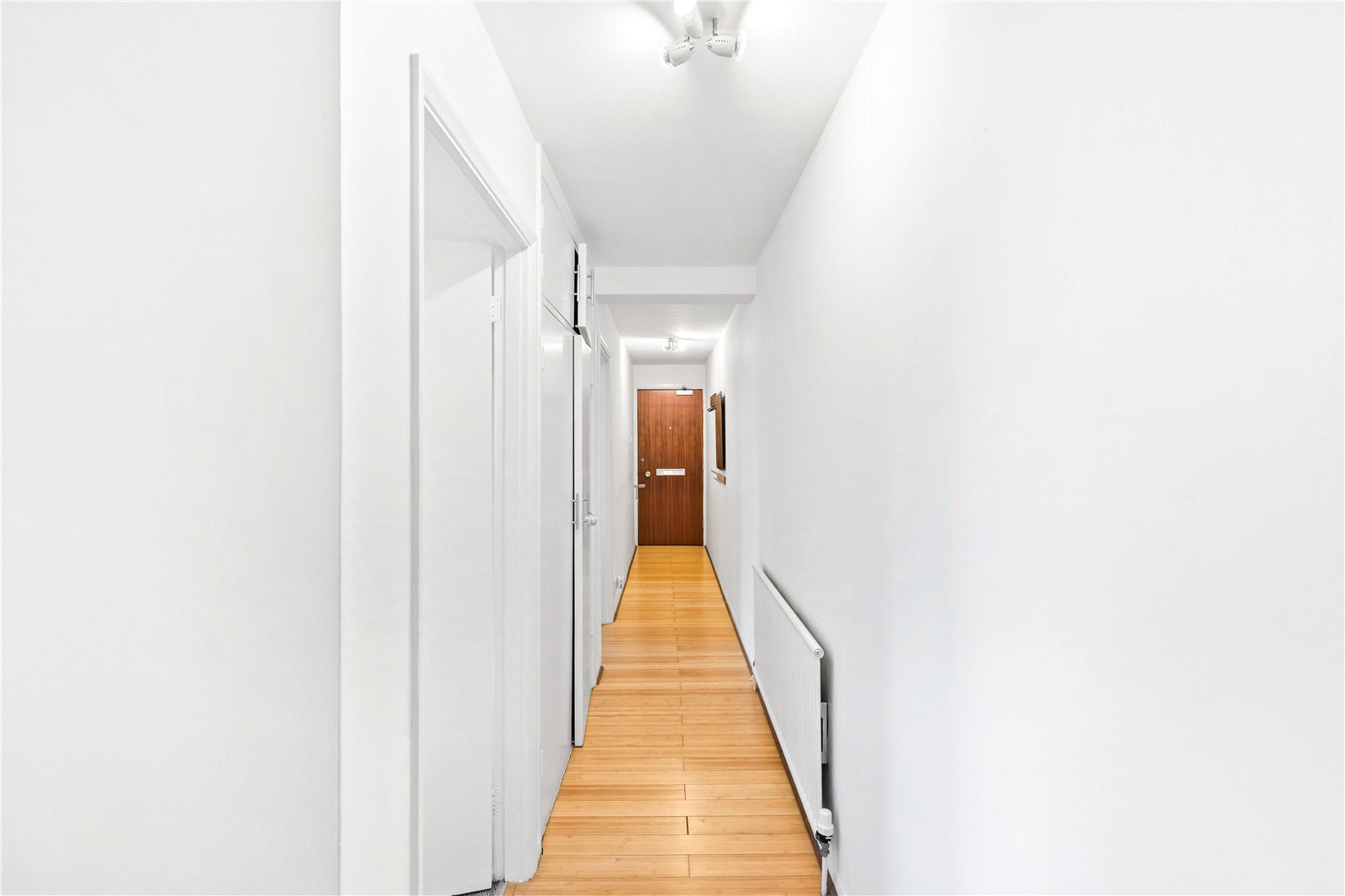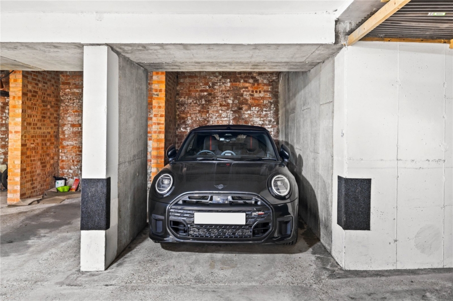 The property comprises two bedrooms, including a generous principal bedroom and a second bedroom well suited as a guest room, home office or study. A bathroom is conveniently positioned off the hallway, with additional built-in storage cupboards providing useful practicality.