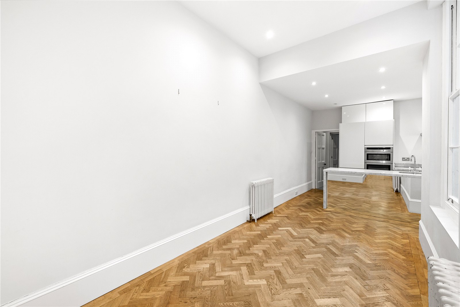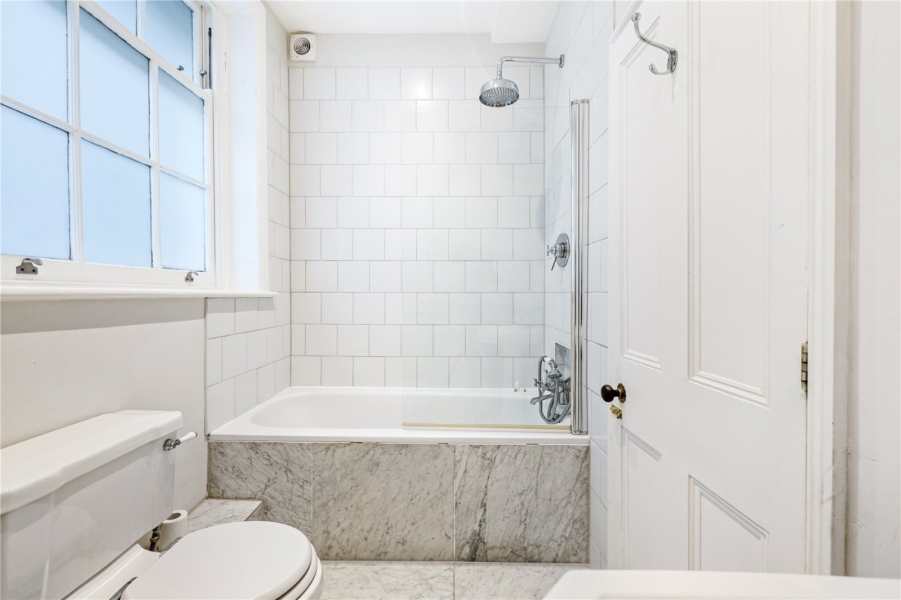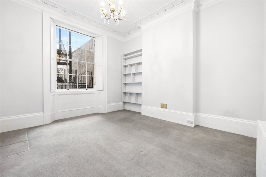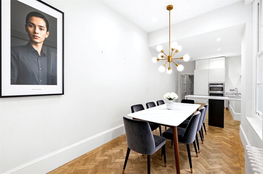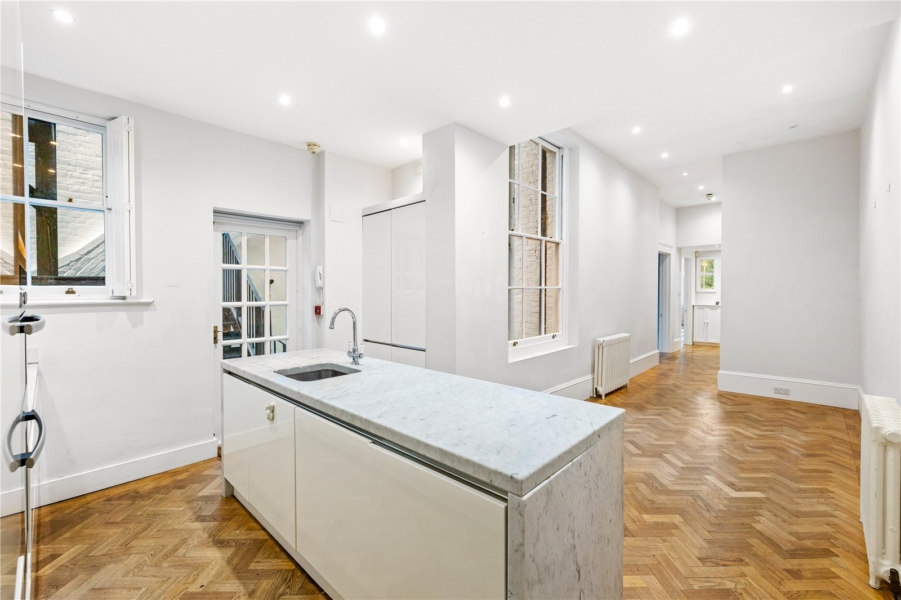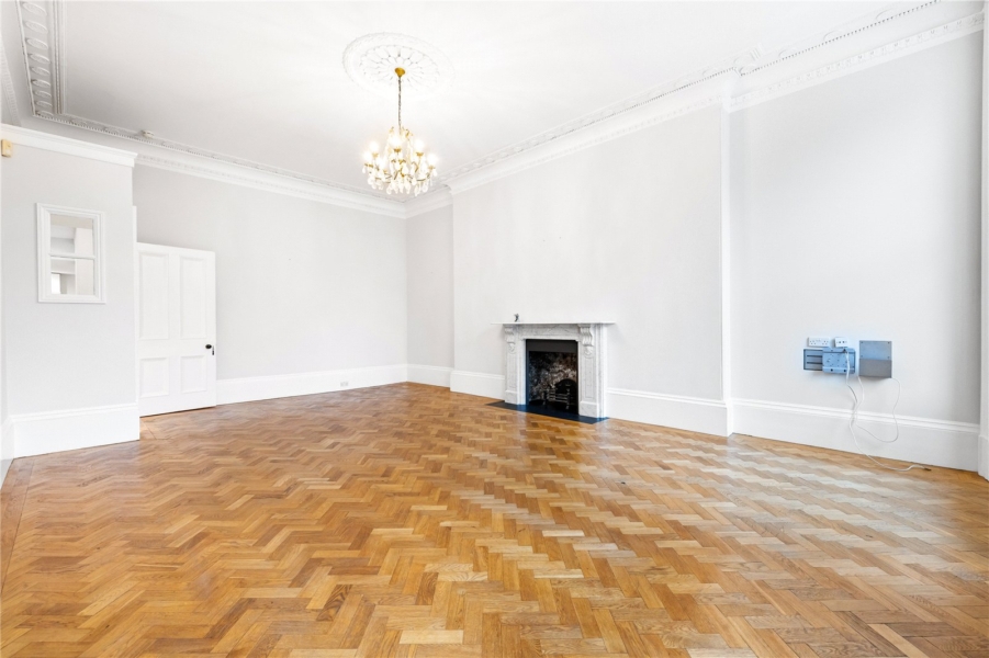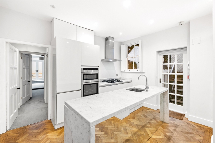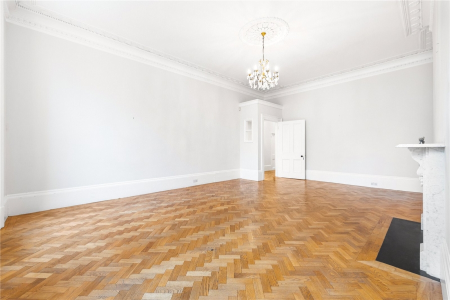 Occupying the entire ground floor, the flat boasts wonderfully generous proportions and an abundance of original character. The impressive living room is particularly striking, featuring exquisite parquet flooring, a marble feature fireplace, soaring ceilings and large sash windows that bathe the space in natural light. The separate kitchen has been thoughtfully designed, combining contemporary style with sympathetic nods to the building’s heritage. Integrated appliances, marble worktops and ample space for dining create a superb setting for both everyday living and entertaining.