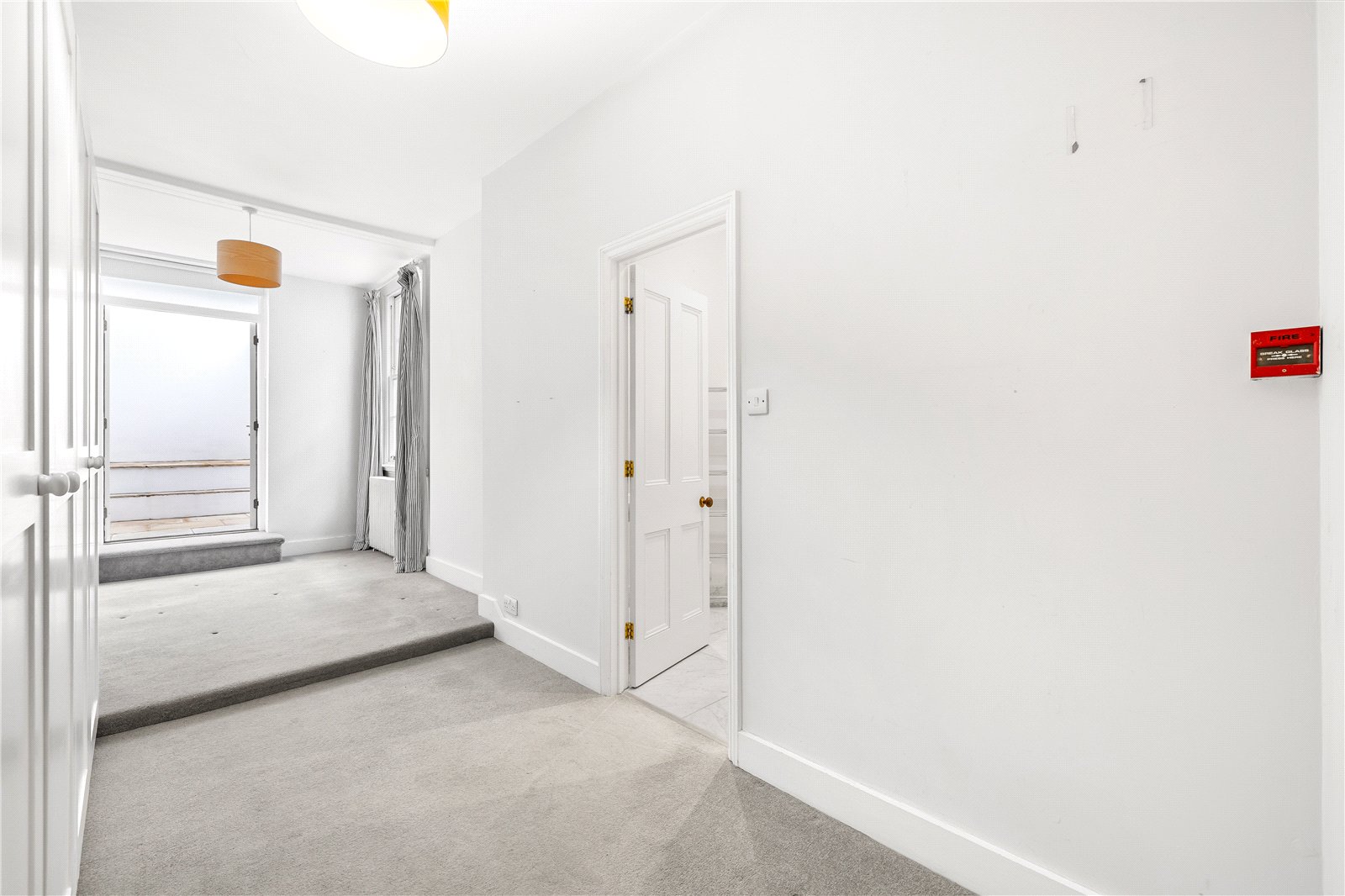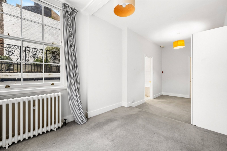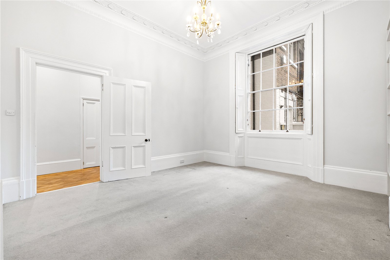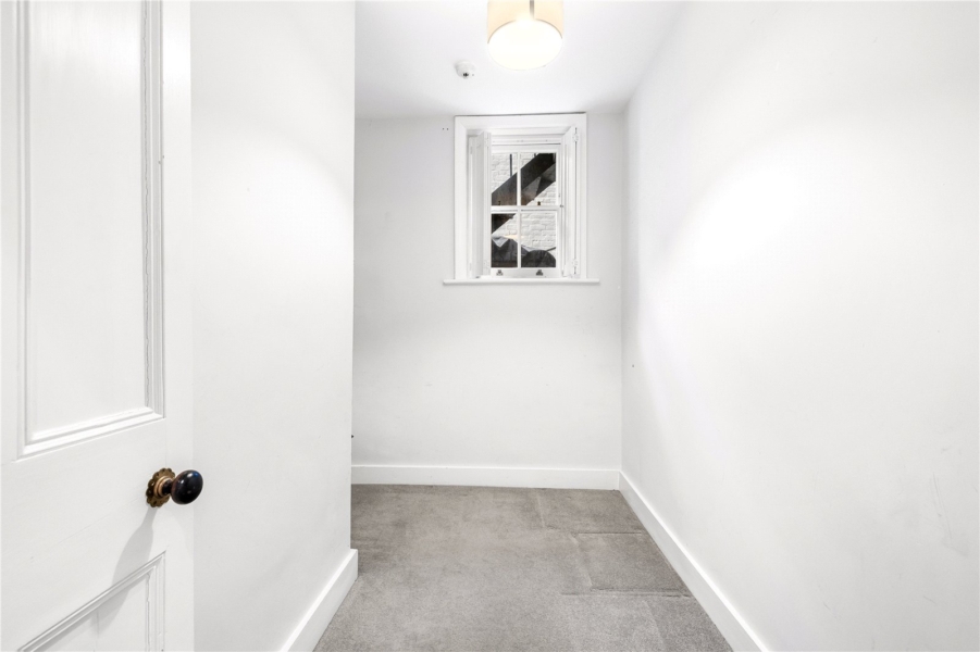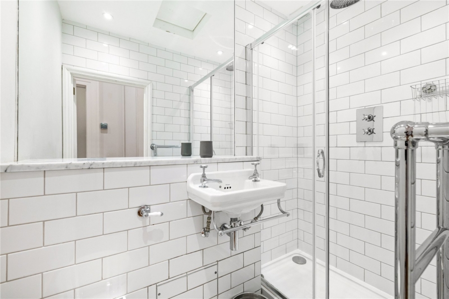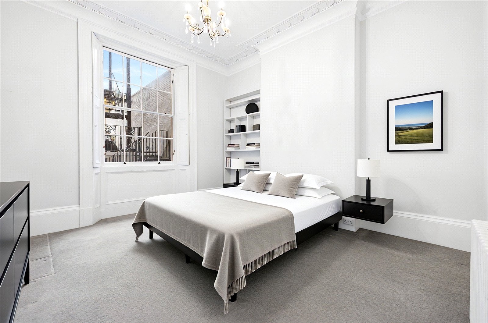 Occupying the entire ground floor, the flat boasts wonderfully generous proportions and an abundance of original character. The impressive living room is particularly striking, featuring exquisite parquet flooring, a marble feature fireplace, soaring ceilings and large sash windows that bathe the space in natural light. The separate kitchen has been thoughtfully designed, combining contemporary style with sympathetic nods to the building’s heritage. Integrated appliances, marble worktops and ample space for dining create a superb setting for both everyday living and entertaining.