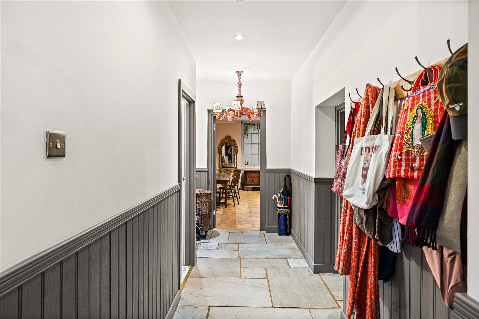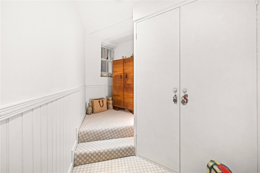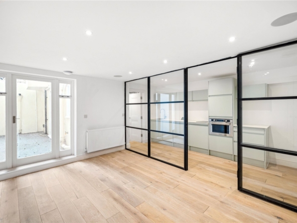 Located on the lower ground floor of Princes Mansions, on the upper terrace of the square, the apartment welcomes you through an atmospheric entrance hall where original flagstones set the tone. Traditional panelling beneath the dado rail has been painted in rich heritage shades, complementing the natural stone and continuing cohesively across the architraves and internal doors.