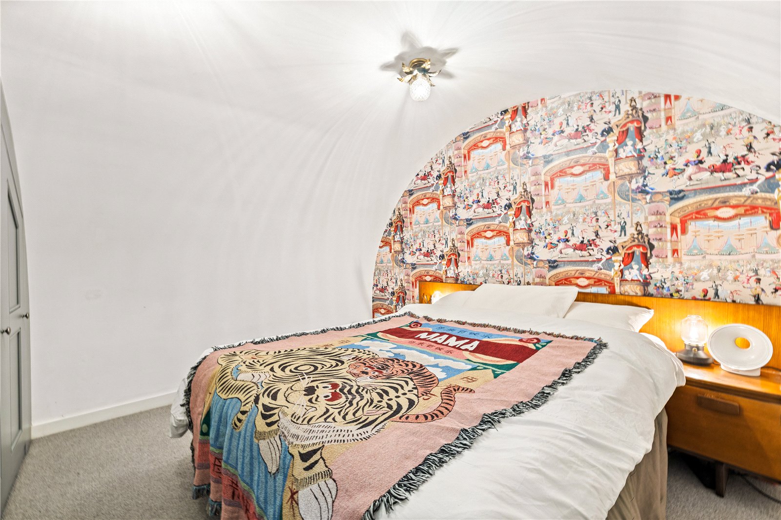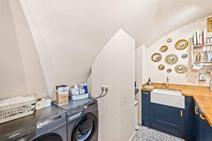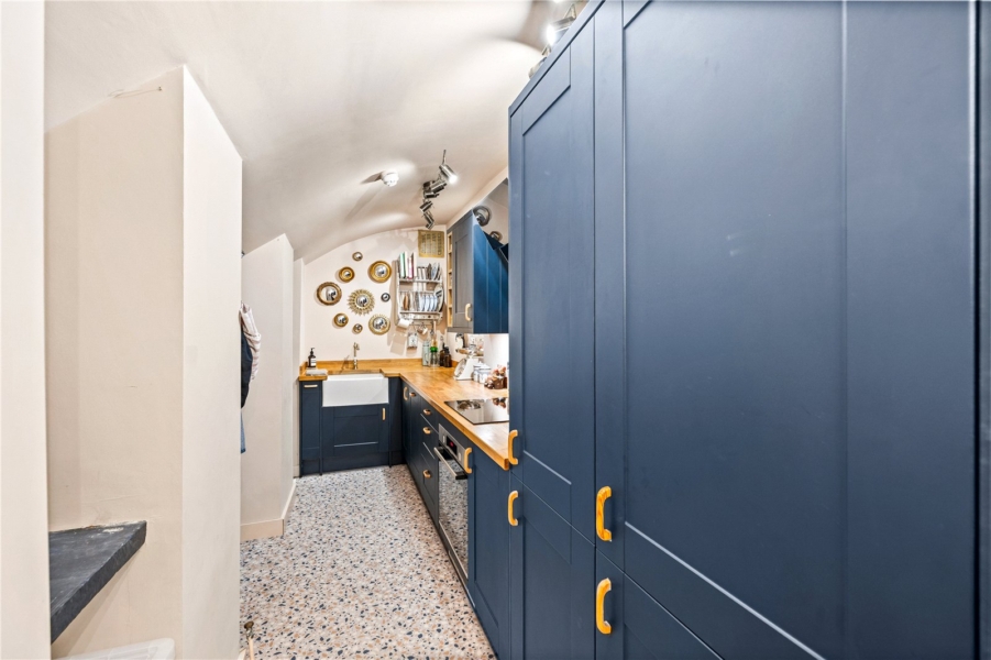 The kitchen has been thoughtfully planned to maximise storage and usability without compromising on style. Deep navy units are paired with solid oak worktops and a terrazzo floor, creating a smart yet characterful finish. Integrated appliances maintain clean lines, while a cleverly arranged utility area tucked beneath a curved wall houses the washing machine and tumble dryer, available by separate negotiation.