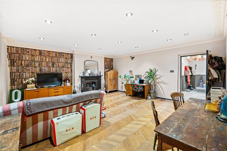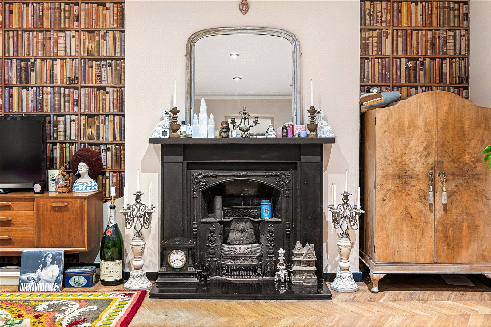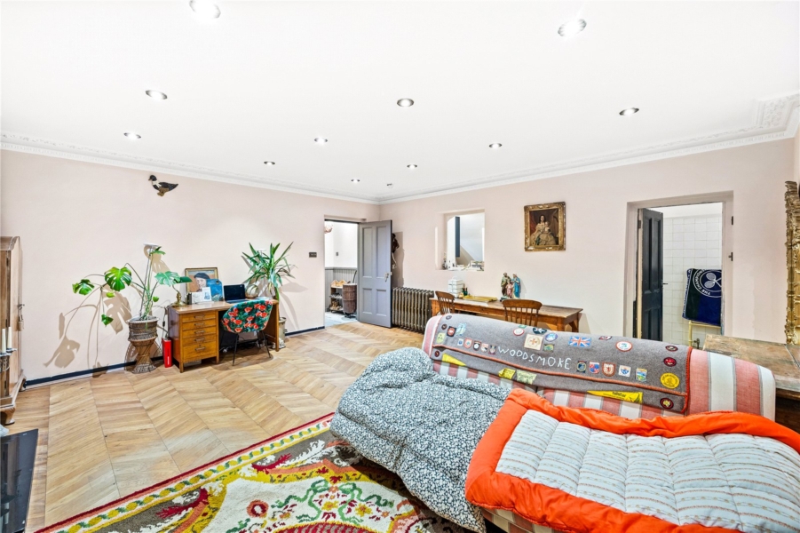 The living room is both generous and inviting, easily accommodating seating and a formal dining area. Two tall sash windows open onto the courtyard, drawing in natural light and enhancing the sense of space. Oak parquet flooring brings warmth underfoot and the property benefits from a grand fireplace, reinforcing the apartment’s period pedigree.